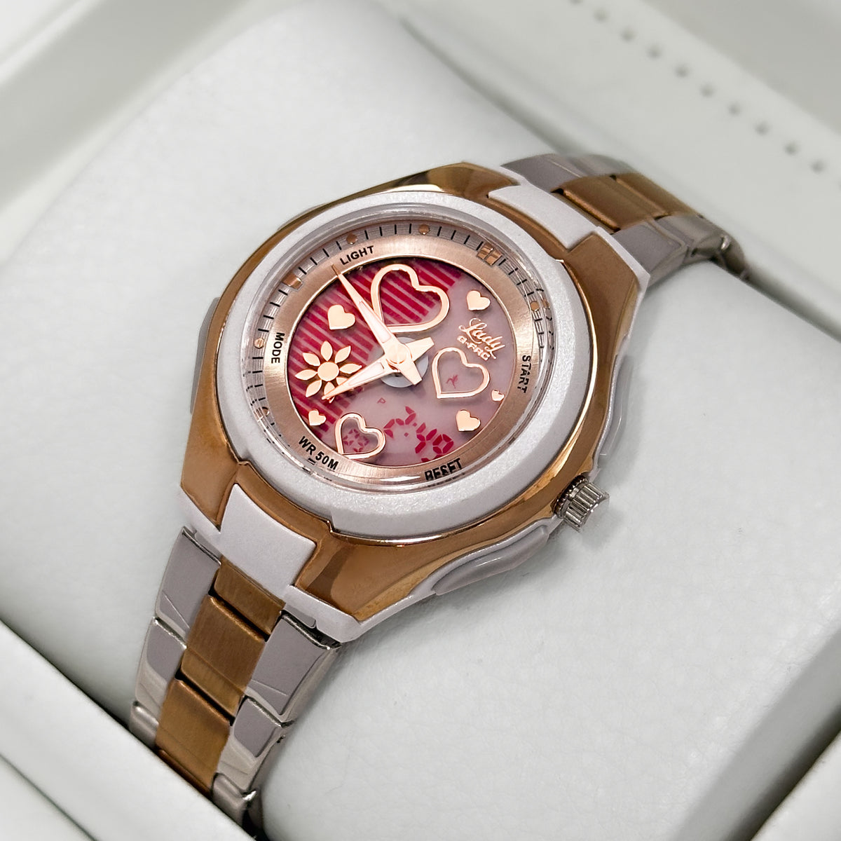 ¡Funcionalidad y un diseño fresco y luminoso! 🤍 El Reloj Lady G-Force AL205 es la pieza ideal para la mujer que busca un accesorio práctico con un toque de elegancia. Su caja niquelada con detalles en un blanco puro se complementa perfectamente con el pulso metálico. La esfera, con un diseño de corazones y una flor, es un detalle encantador que le da un aire femenino. Con la función de doble hora y una sólida tapa de tornillos, este reloj está diseñado para tu día a día con estilo y comodidad.