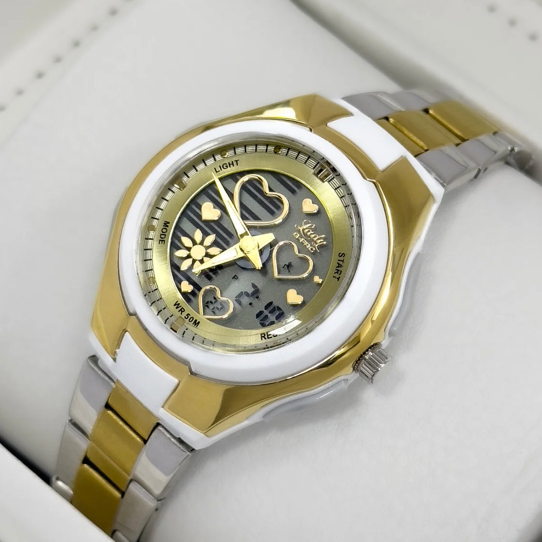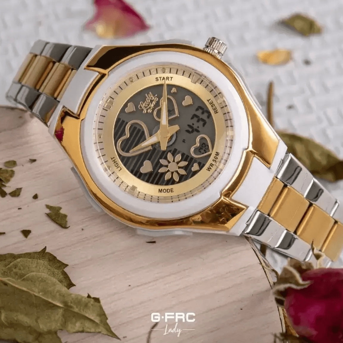 ¡Un reloj que irradia encanto y funcionalidad para la mujer moderna! 💖 El Reloj Lady G-Force AL206-PD combina un diseño vibrante con características prácticas que te encantarán. Su atractiva caja niquelada con detalles en blanco y dorado, y su esfera con un toque romántico de corazones y una flor, se complementan con un resistente pulso metálico en dos tonos. Además, ofrece la comodidad de la doble hora y es resistente al agua (WR 50M), convirtiéndolo en el compañero ideal para tu día a día.