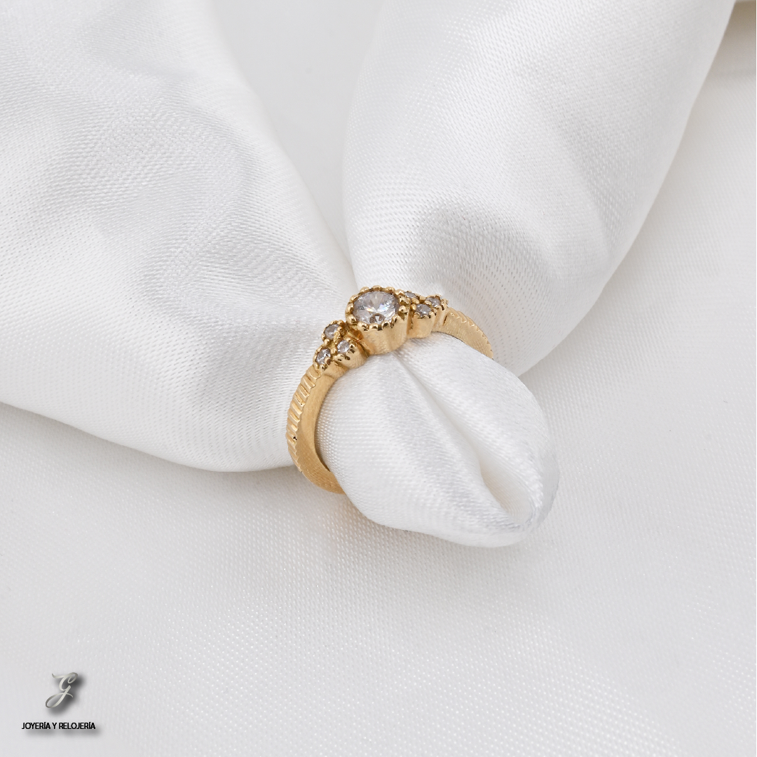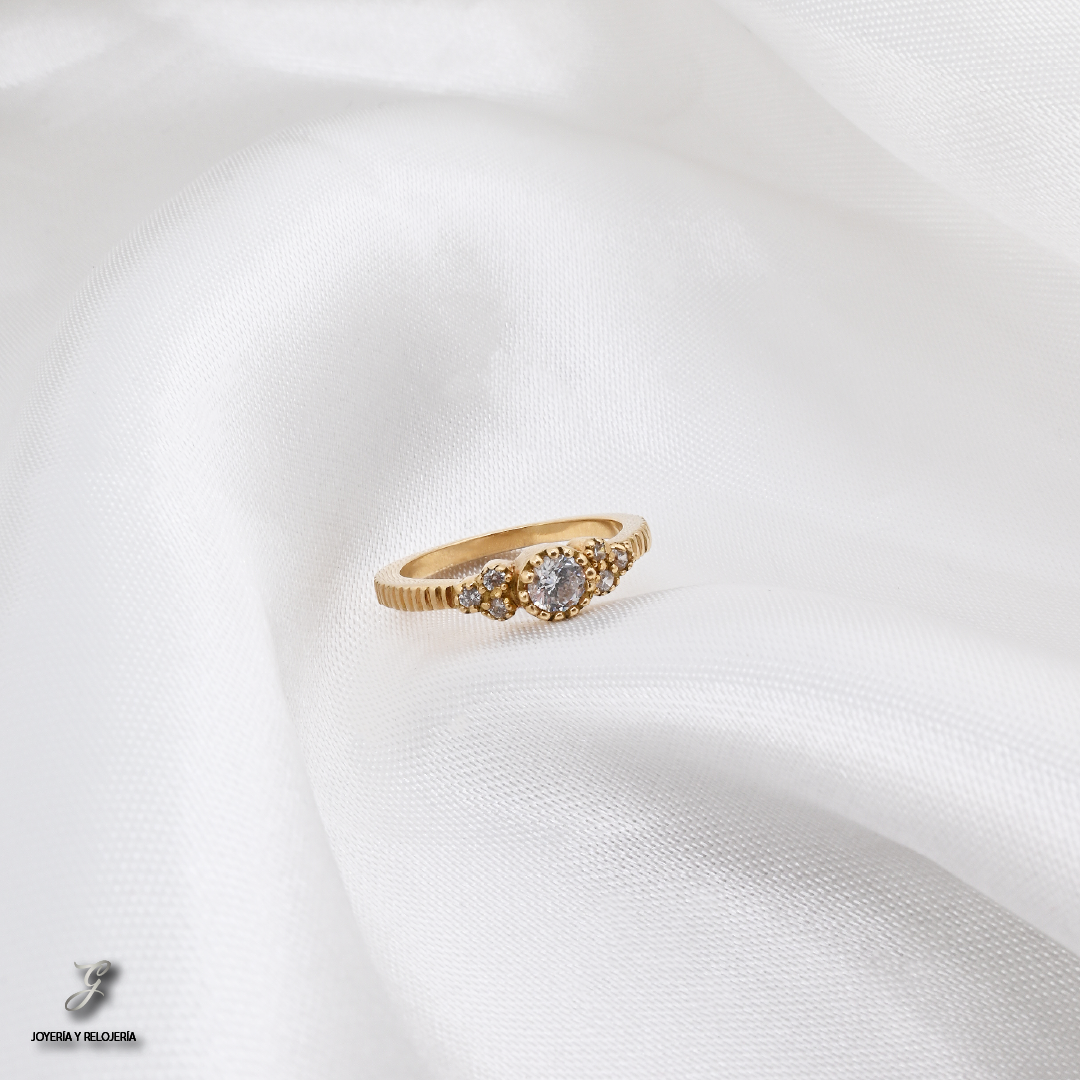 ¡La elección perfecta para un momento eterno! 💖 El Anillo Compromiso Clásico es una joya atemporal diseñada para capturar la esencia de un amor verdadero. Elaborado en oro 18K, Ley 730, este anillo cuenta con un circón central rodeado por un halo de circones más pequeños, que se extienden a lo largo de la banda para un brillo inigualable. Su diseño es ideal tanto para un compromiso como para un regalo de aniversario.