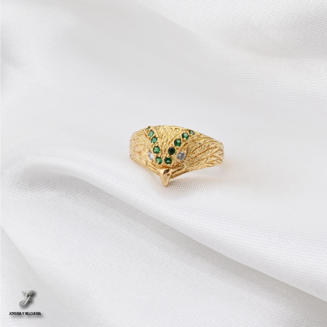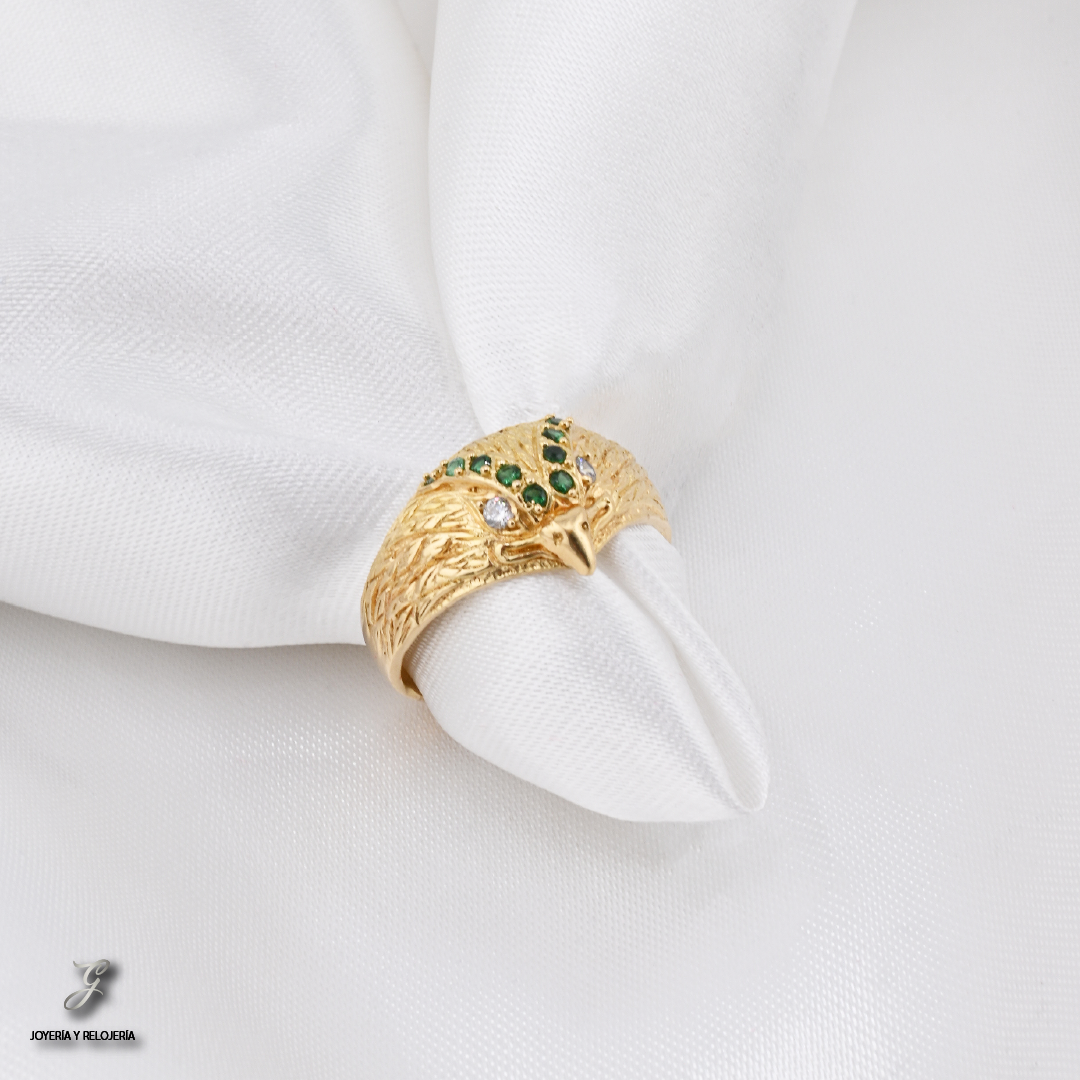 ¡Lleva contigo un símbolo de poder y visión! 🦅 El Anillo Águila Imperial es una pieza audaz y majestuosa, perfecta para el caballero que no teme destacar. Elaborado en oro 18K, Ley 730, este anillo presenta la forma de una cabeza de águila con detalles finamente grabados que simulan el plumaje. Circones verdes y blancos, con un corte redondo, se incrustan en la cabeza, dándole un brillo imponente y un toque de color que simula sus ojos penetrantes.