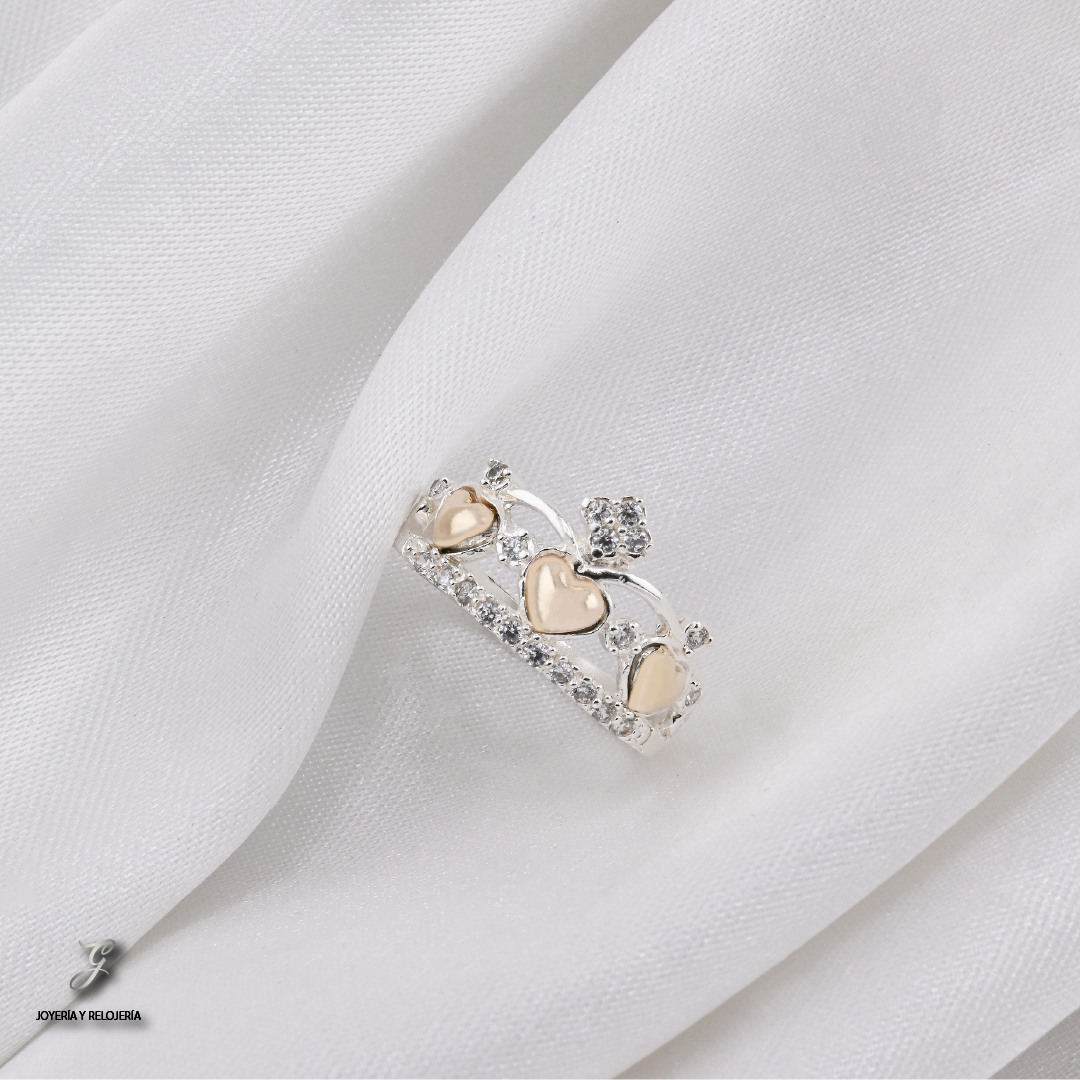 ¡Un diseño lleno de amor y realeza! 👑 Este encantador anillo de corona, elaborado en Plata Ley 925 italiana, se distingue por sus tres corazones de lámina de Oro de 18K que se elevan sobre la base. La corona está finamente adornada con piedras incrustadas, creando un efecto brillante y majestuoso. Es una joya perfecta para quienes buscan una pieza que combine la belleza de un diseño clásico con un profundo simbolismo de amor y poder.