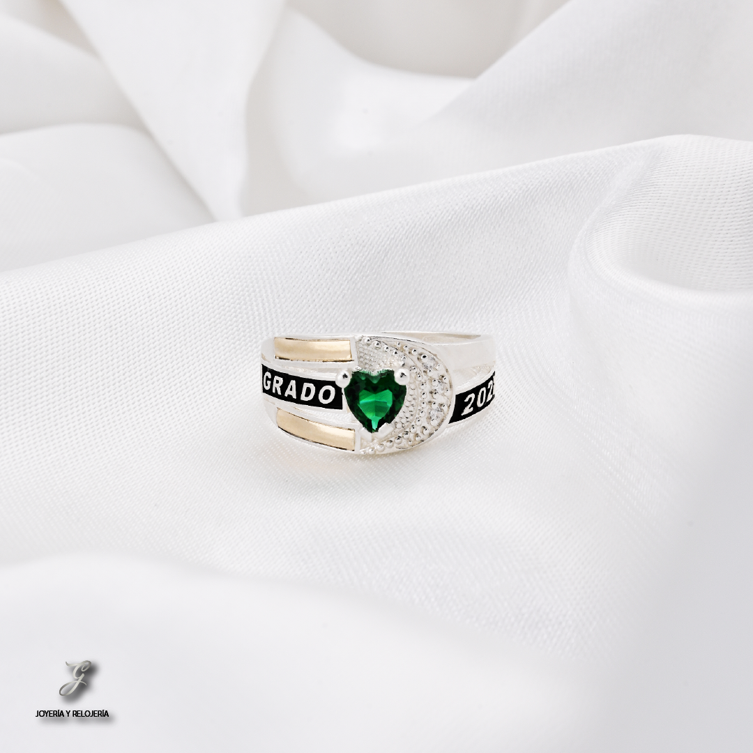 ¡Un símbolo de tu logro con un toque de distinción! 🎓 Este elegante Anillo de Grado EL CAIRO 15 es una joya excepcional que combina la pureza de la Plata Ley 925 con el realce de una lámina de Oro de 18 Kilates. Su diseño presenta una imponente piedra central de Circon Suizo en forma de corazón, que simboliza la excelencia y la pasión de tu camino recorrido. Las hileras de pequeños circones a los lados añaden un destello de sofisticación. El grabado "GRADO" y el año se realzan con elegancia en los costados.