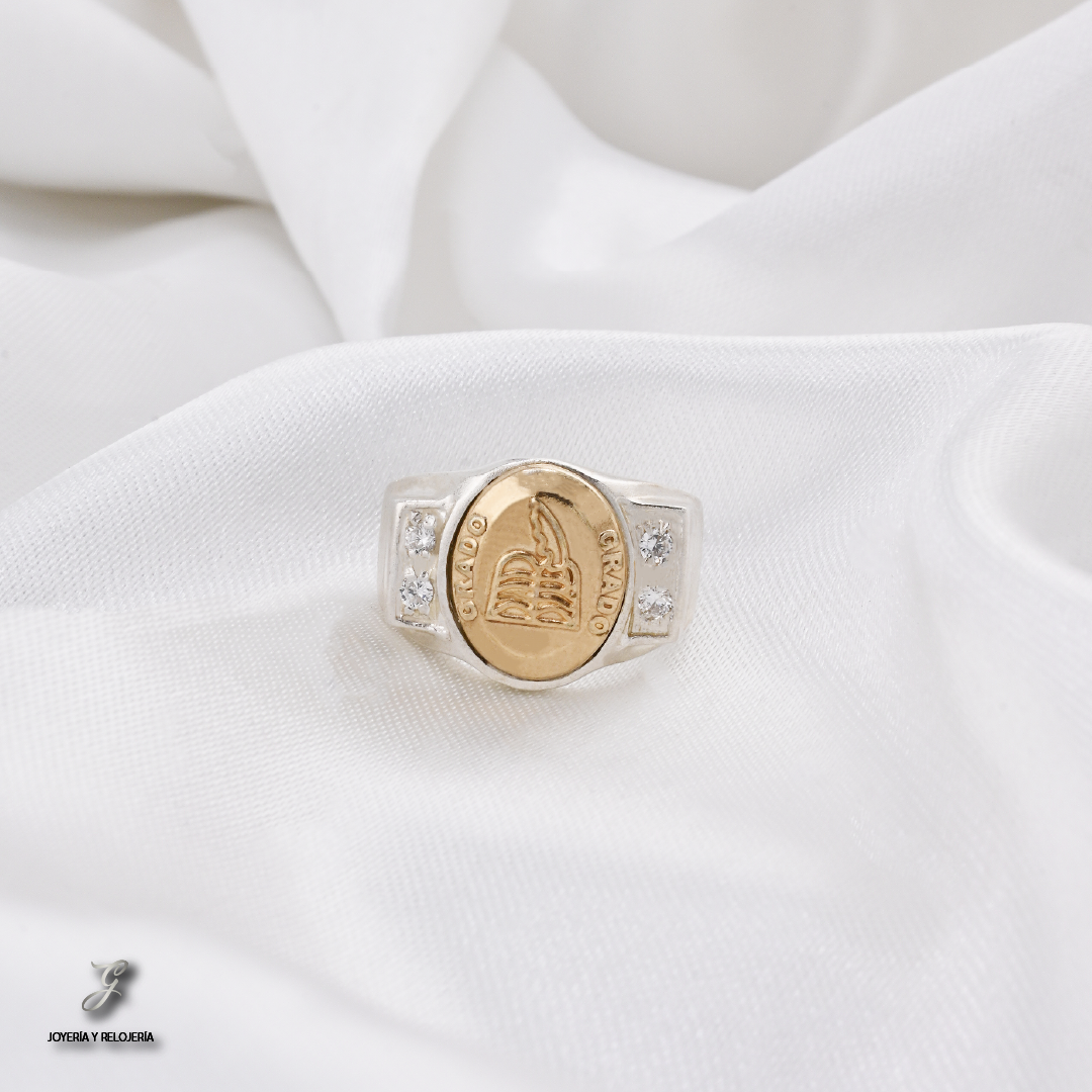 ¡Celebra tu logro académico con un distintivo lleno de significado! 🎓 Este imponente Anillo de Grado MOSCÚ 01 es una joya excepcional que combina la elegancia de la Plata Ley 925 con el realce de una lámina de Oro de 18 Kilates. Su diseño principal destaca con un escudo ovalado central que presenta, en relieve, un libro abierto y una pluma, símbolos clásicos del conocimiento y la escritura, perfectos para conmemorar tu graduación. A los lados, pequeños Circones Suizos añaden un toque de brillo y sofisticación.