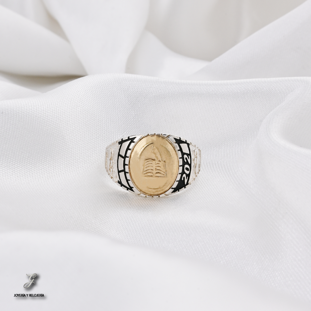¡Celebra tu logro académico con un distintivo lleno de significado! 🎓 Este imponente Anillo de Grado DUBÁI 02 es una joya excepcional que combina la elegancia de la Plata Ley 925 con el realce de una lámina de Oro de 18 Kilates. Su diseño principal destaca con un escudo ovalado central que presenta, en relieve, un libro abierto y una pluma, símbolos clásicos del conocimiento y la escritura, perfectos para conmemorar tu graduación. A los lados, el año de graduación y un patrón de líneas resaltan el diseño.
