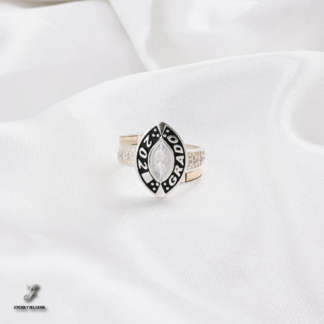 ¡Un distintivo de tu logro académico con estilo y distinción! 🎓 Este elegante Anillo de Grado VIENA 07 es una joya excepcional que combina la pureza de la Plata Ley 925 con el realce de una lámina de Oro de 18 Kilates. Su diseño presenta una imponente piedra central de Circon Suizo en corte marquesa, que simboliza la excelencia y la fuerza de tu camino recorrido. Las hileras de pequeños circones a los lados añaden un destello de sofisticación. El grabado "GRADO" y el año se realzan con elegancia en los costados.
