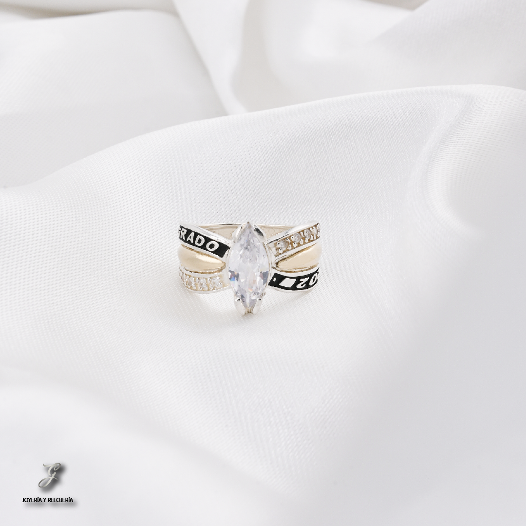 ¡Un distintivo de tu logro académico con estilo y distinción! 🎓 Este elegante Anillo de Grado PARÍS 08 es una joya excepcional que combina la pureza de la Plata Ley 925 con el realce de una lámina de Oro de 18 Kilates. Su diseño presenta una imponente piedra central de Circon Suizo en corte marquesa, que simboliza la excelencia y la fuerza de tu camino recorrido. Las hileras de pequeños circones a los lados añaden un destello de sofisticación. El grabado "GRADO" y el año se realzan con elegancia en los costados.