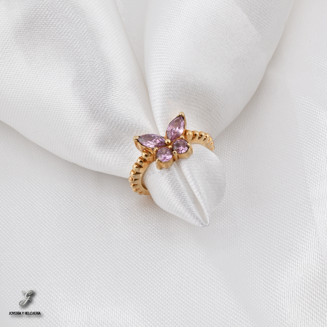 ¡Celebra la transformación y la libertad con esta pieza mágica! ✨ El Anillo Mariposa de Luz es una joya delicada y encantadora, ideal para la mujer que aprecia la belleza de la naturaleza. Elaborado en oro 18K, Ley 730, este anillo presenta una mariposa detallada con alas adornadas con circones morados de corte marquesa, que se complementan con pequeños circones blancos redondos en su cuerpo. La banda, con su sutil textura, le da a la joya un aire único y artesanal.