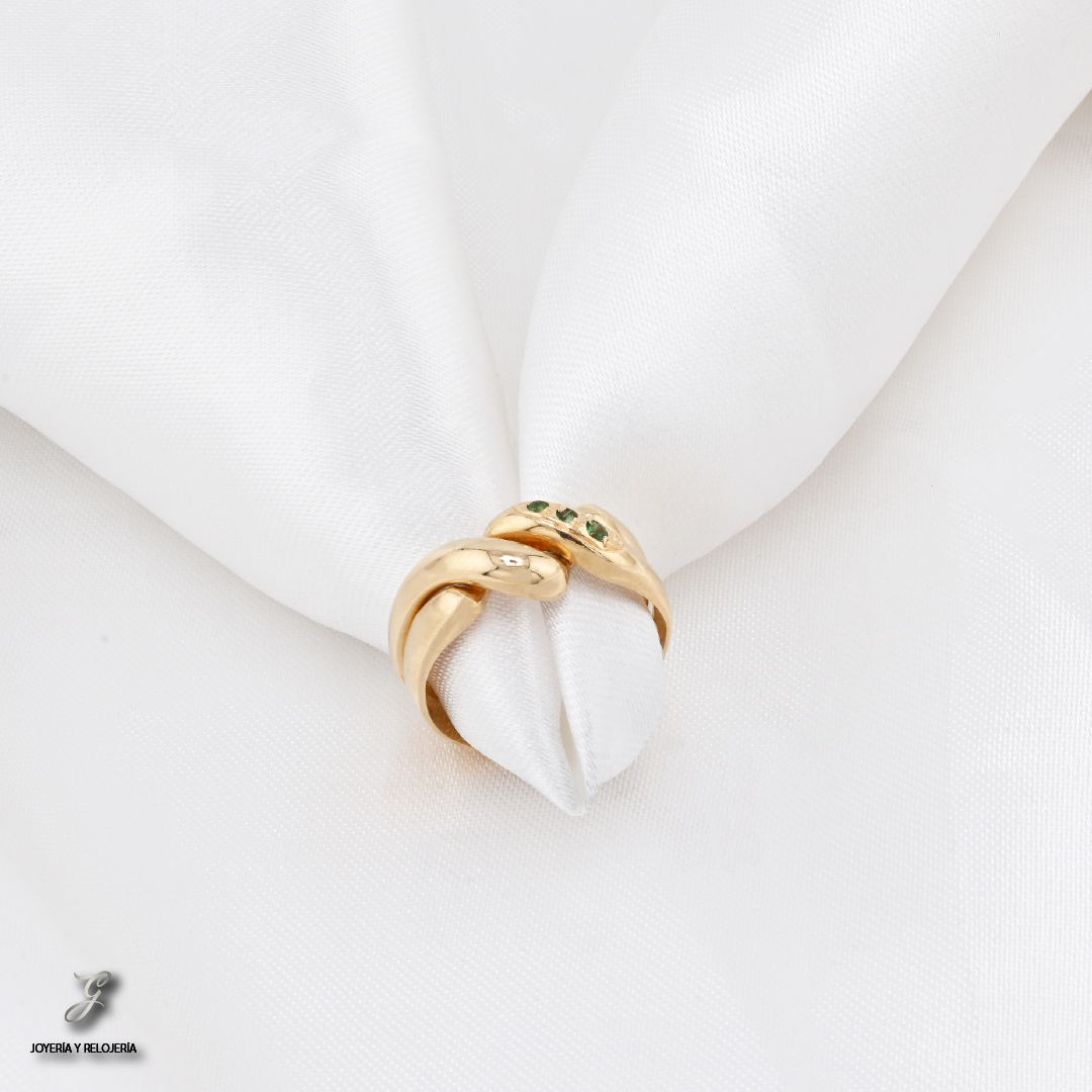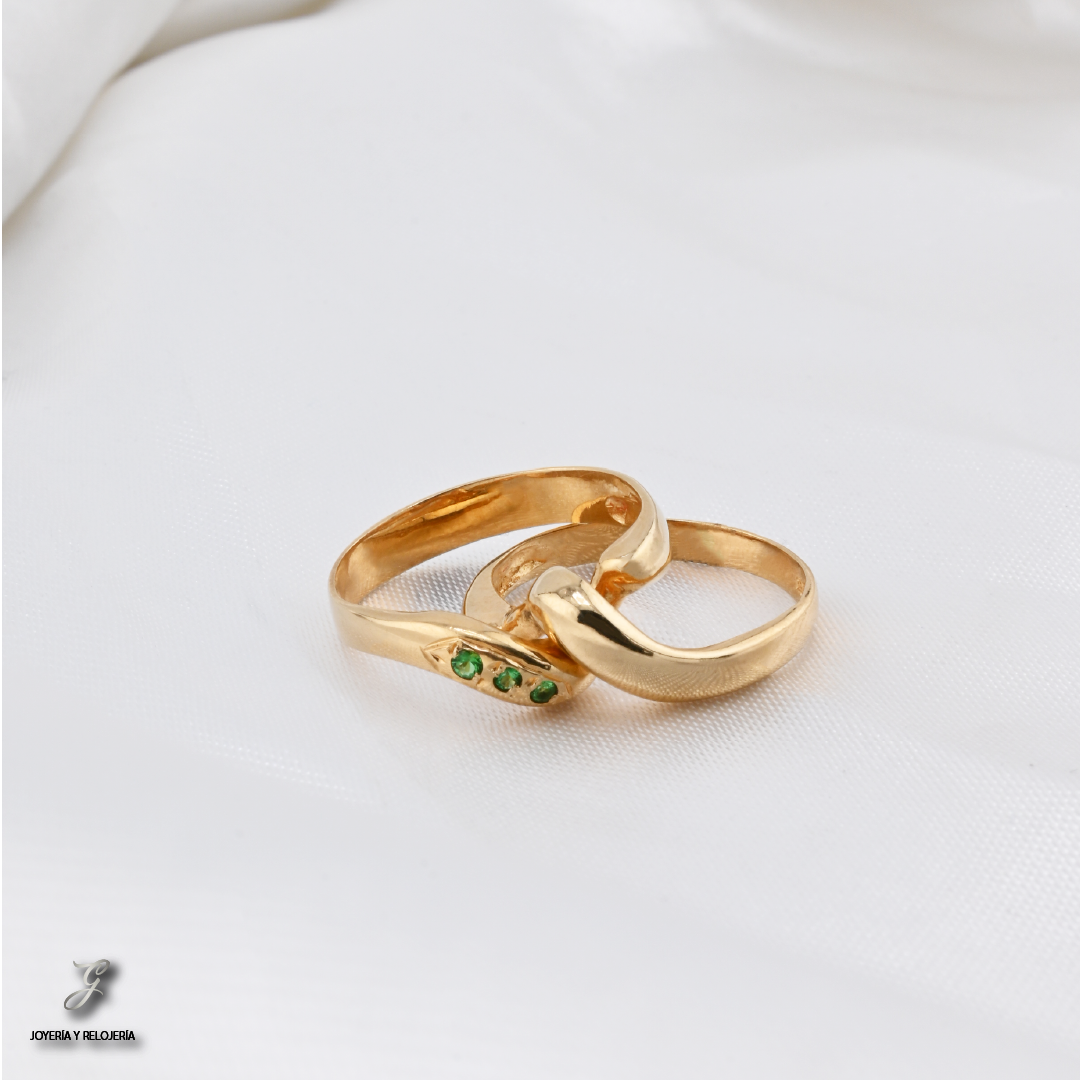 ¡El lazo de un amor eterno! 🔗 El Anillo Nudo del Amor es una joya única compuesta por dos anillos entrelazados que simbolizan la unión y el compromiso. Elaborado en oro 18K, Ley 730, un aro presenta un acabado liso mientras que el otro está finamente texturizado y adornado con tres vibrantes circones verdes que añaden un toque de color y sofisticación. Su diseño es perfecto para quienes desean una joya con un significado profundo y un estilo distintivo.