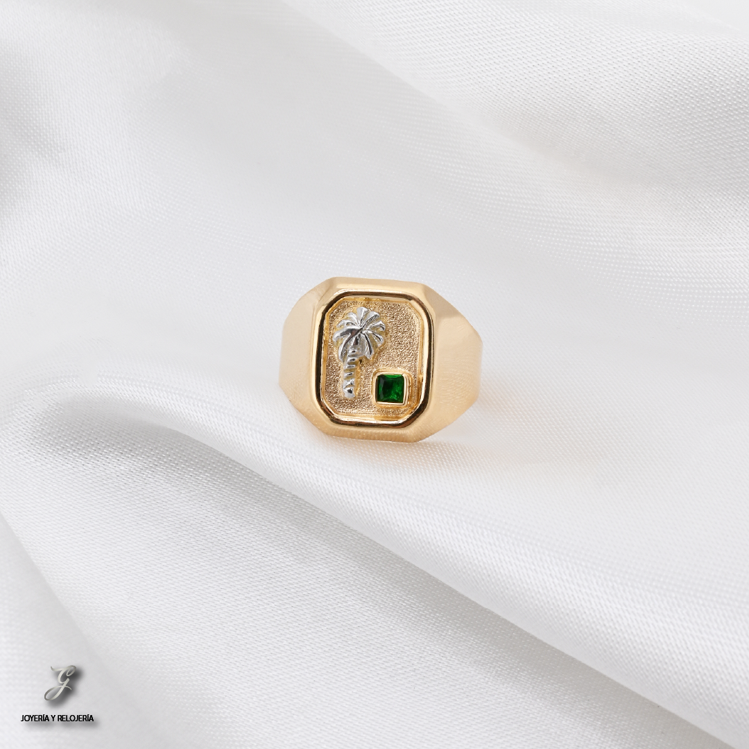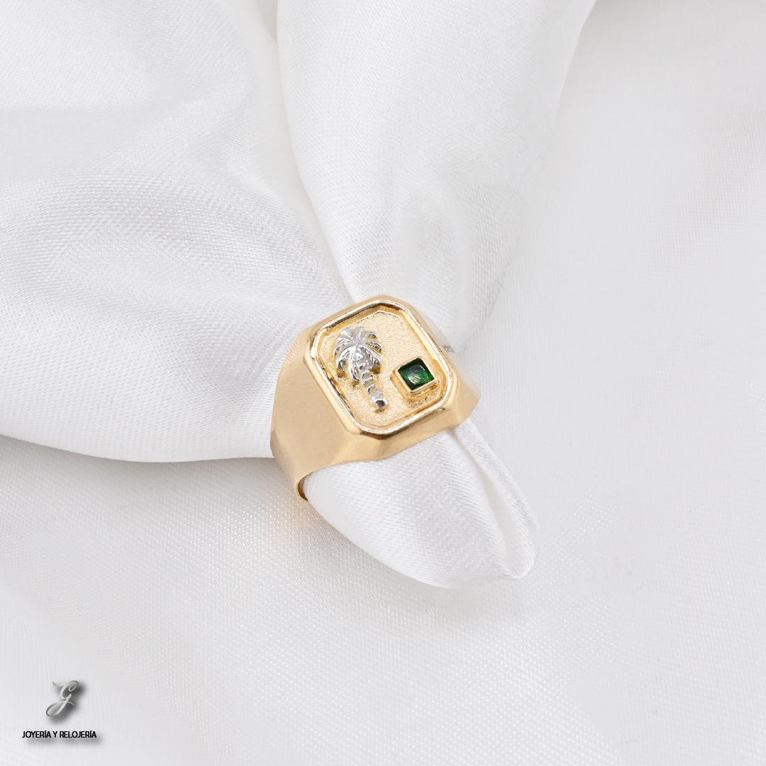 ¡El accesorio perfecto para el caballero con espíritu de aventura! 🏝️ El Anillo Hombre Caribe es una pieza que combina un diseño clásico con un toque exótico. Elaborado en oro 18K bicolor (amarillo y blanco), Ley 730, su parte superior presenta una delicada palmera junto a un vibrante circón verde de alta calidad con corte cuadrado. Este anillo es ideal para el hombre que busca una joya que refleje su personalidad única y sofisticada.