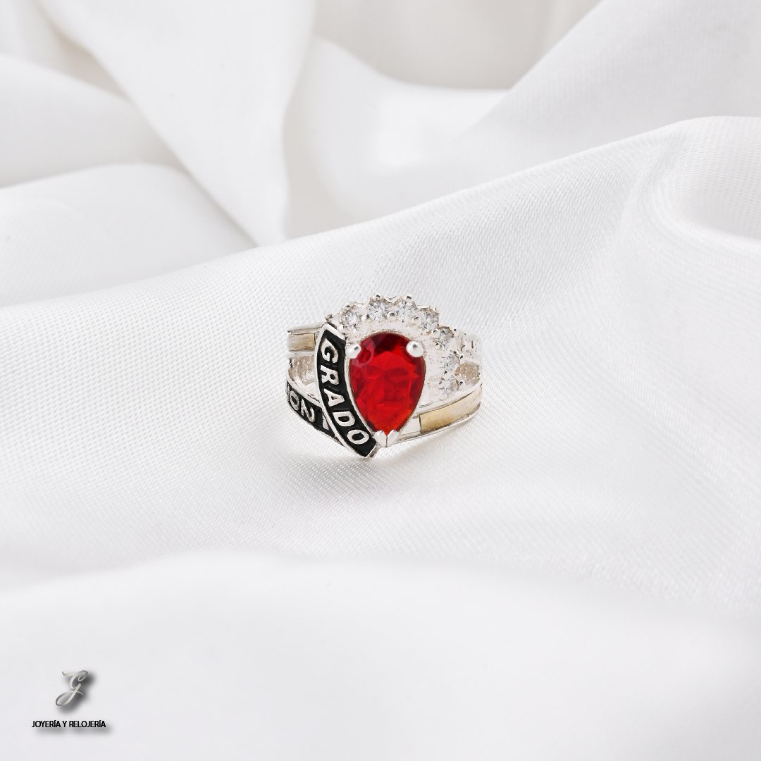¡Un símbolo radiante de tu éxito académico! 🎓 Este elegante Anillo de Grado TOKIO 03 es una pieza excepcional que combina la distinción de la Plata Ley 925 con el realce de una lámina de Oro de 18 Kilates. Su diseño sofisticado presenta una deslumbrante piedra central de Circon Suizo en forma de gota, rodeada de pequeños circones que maximizan su brillo y lo convierten en el centro de todas las miradas. El grabado "GRADO" se destaca con elegancia en un distintivo banner negro.