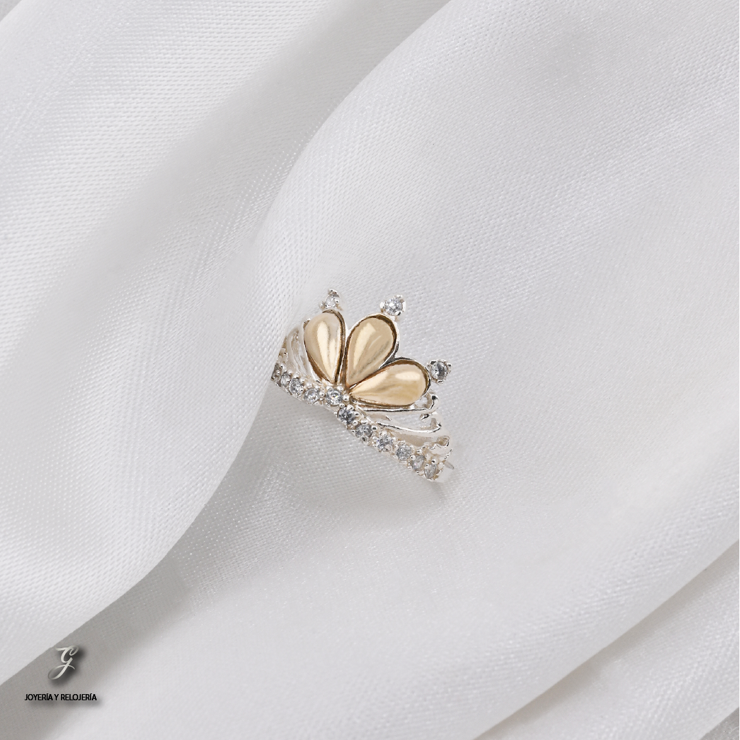 ¡Un diseño que irradia poder y majestuosidad! 👑 Este opulento anillo de corona, elaborado en Plata Ley 925 italiana, se distingue por su imponente diseño. Presenta tres prominentes pétalos de lámina de Oro de 18K en la parte superior, los cuales están rodeados de un resplandor de piedras incrustadas. Es una pieza única y audaz, ideal para quienes desean una joya que transmita confianza y realeza.