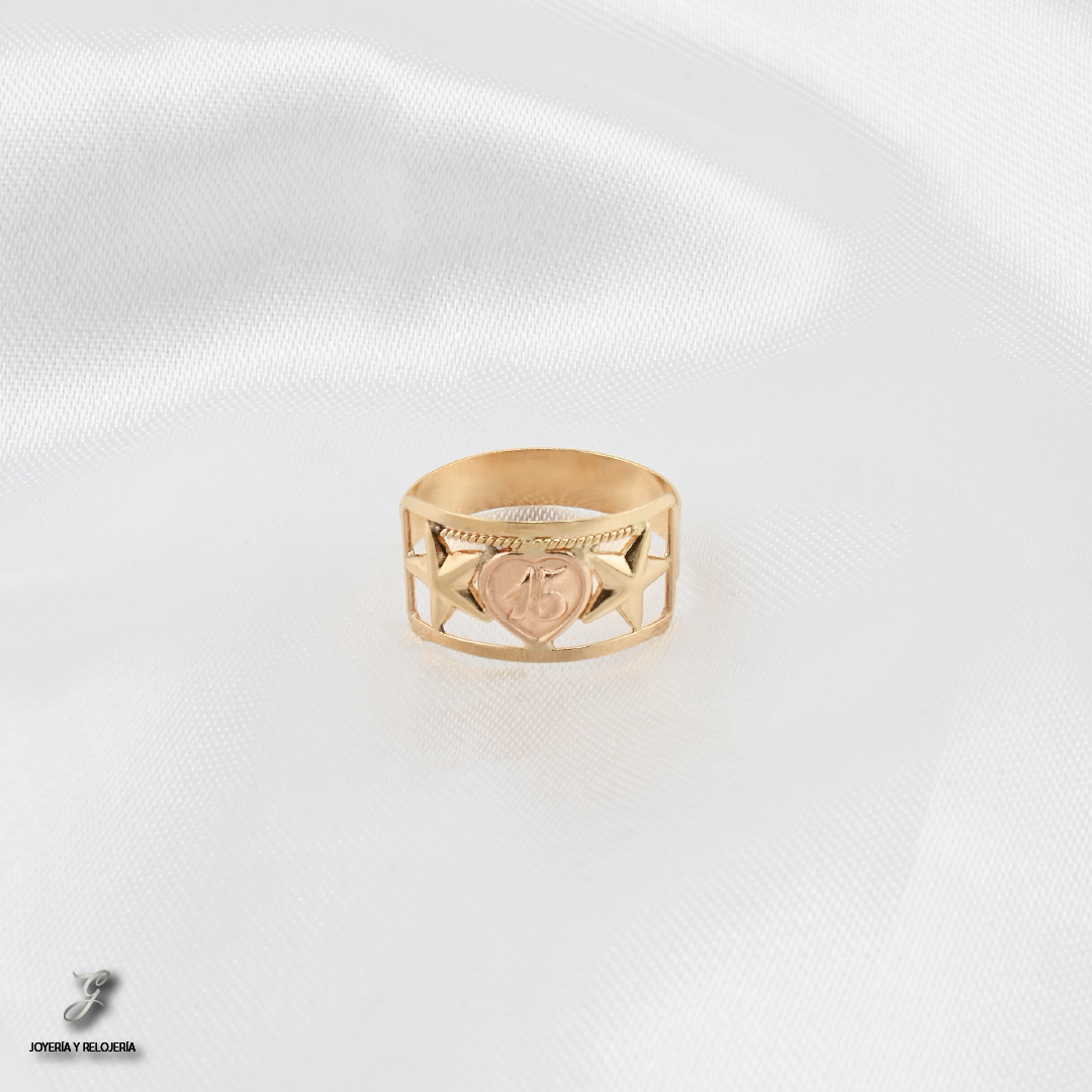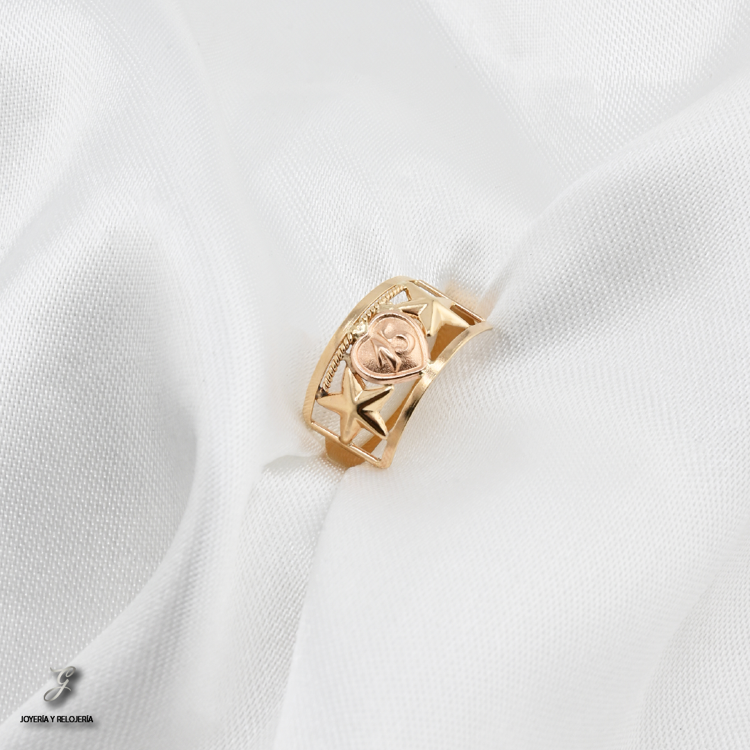 ¡Una joya que celebra un futuro tan brillante como las estrellas! ✨ El Anillo Quinceañera Corazón Estelar es una pieza que combina un diseño moderno con un simbolismo clásico y lleno de sentimiento. Elaborado en oro 18K, Ley 730, este anillo presenta un corazón central en oro rosa con el número "15" en su interior, flanqueado por dos estrellas caladas a cada lado. Es una pieza audaz y elegante, perfecta para celebrar la llegada de una nueva etapa llena de sueños y amor.