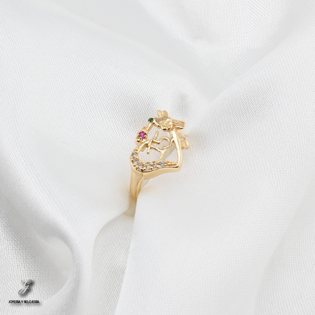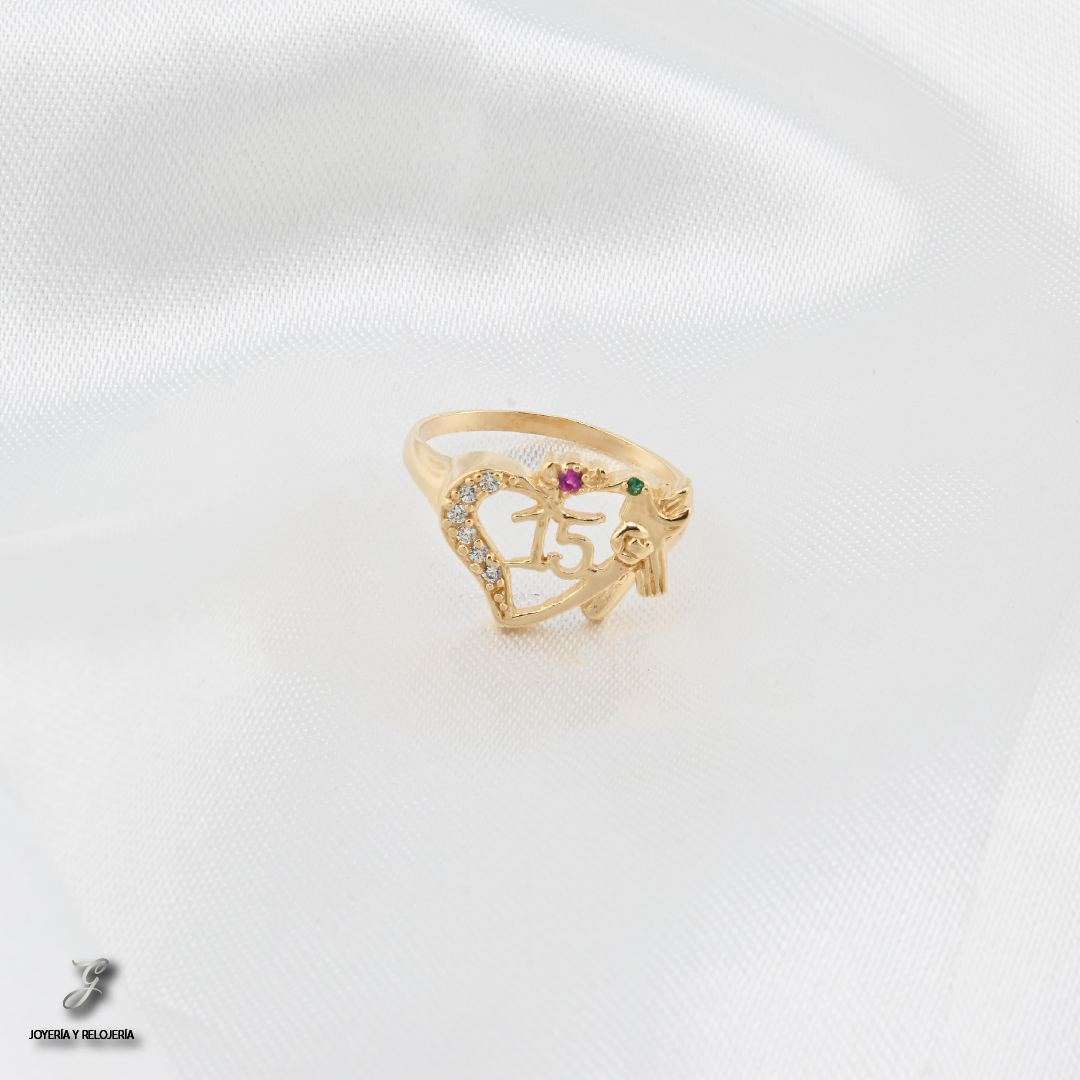 ¡Una joya que celebra el amor y la alegría de este nuevo vuelo! 🐦 El Anillo Quinceañera Corazón de Colibrí es una pieza llena de vida y simbolismo. Elaborado en oro 18K, Ley 730, este hermoso anillo presenta un corazón con el número "15" en su centro, adornado con brillantes circones blancos. Un delicado colibrí se posa a su lado, con circones de colores rojos y verdes que le dan un toque vibrante y único.