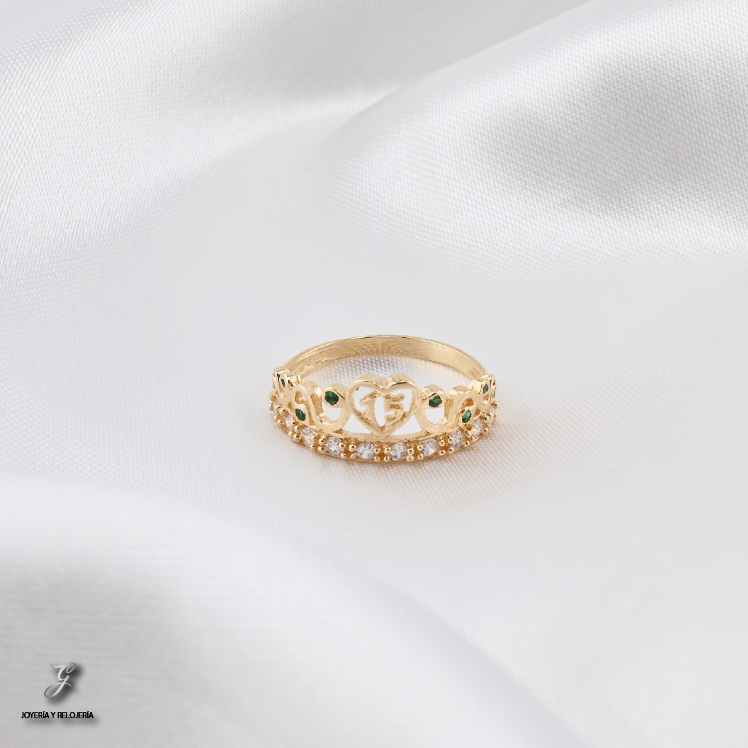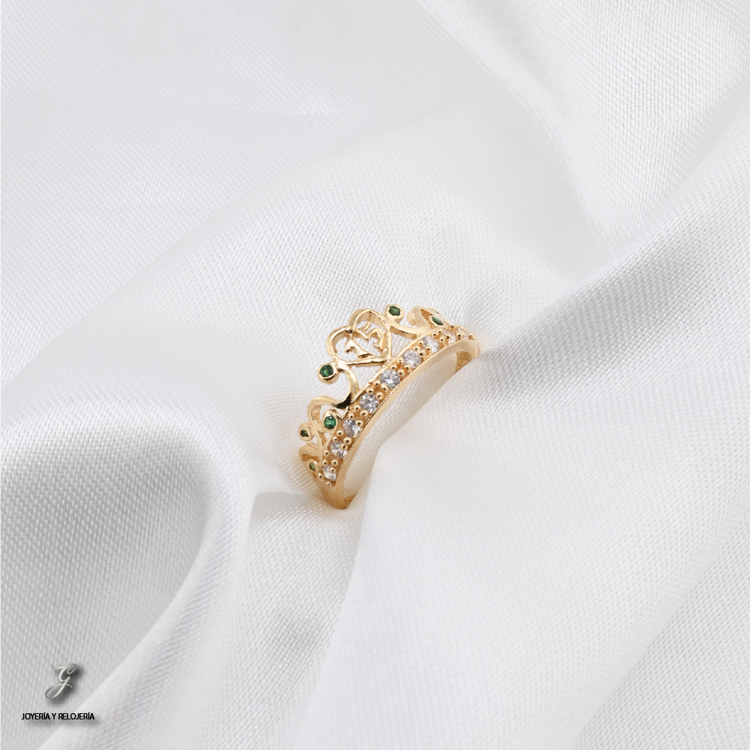 ¡Haz que tu celebración de 15 años sea digna de una princesa! 💎 El Anillo Corona de los Sueños es la joya perfecta para honrar a la reina de la noche. Elaborado en oro 18K, Ley 730, este delicado anillo de 15 años presenta un diseño de corona, adornado con brillantes circones verdes redondos que le dan un toque de color y distinción. Su diseño elegante y simbólico lo convierte en el regalo ideal para marcar este hito inolvidable.