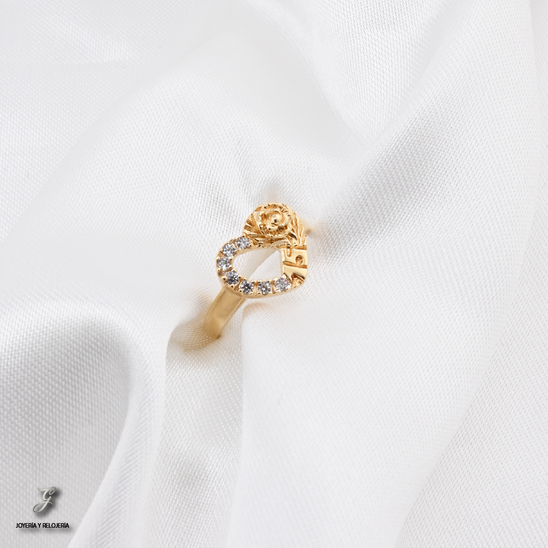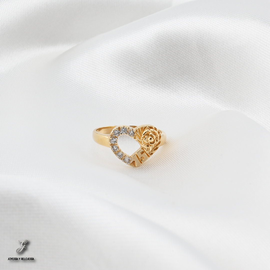 ¡El regalo perfecto para celebrar el florecimiento de una nueva etapa! 💖 El Anillo Quinceañera Rosa Eterna es una joya llena de simbolismo para conmemorar los 15 años. Elaborado en oro 18K, Ley 730, este hermoso anillo presenta un delicado diseño de corazón en cuyo interior se detalla el número "15" y una elegante rosa. Pequeños circones blancos de corte redondo añaden un brillo sutil al contorno del corazón, creando una pieza que celebra la transición de niña a mujer.