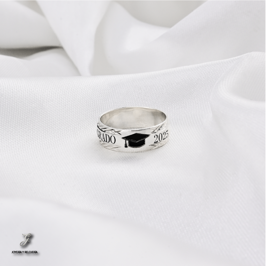 ¡Un diseño simple y elegante para celebrar tu logro! 🎓 Esta Argolla de Grado MONTERREY 01 es una joya atemporal diseñada para conmemorar tu esfuerzo y dedicación. Fabricada únicamente en Plata Ley 925, esta argolla destaca por su diseño liso con grabados precisos. La banda lleva la palabra "GRADO", un icónico birrete de graduación y el año 2025, resaltados con esmalte negro para un contraste que le da un toque distintivo. Los bordes superior e inferior de la argolla tienen un delicado relieve que añade textura y sofisticación.