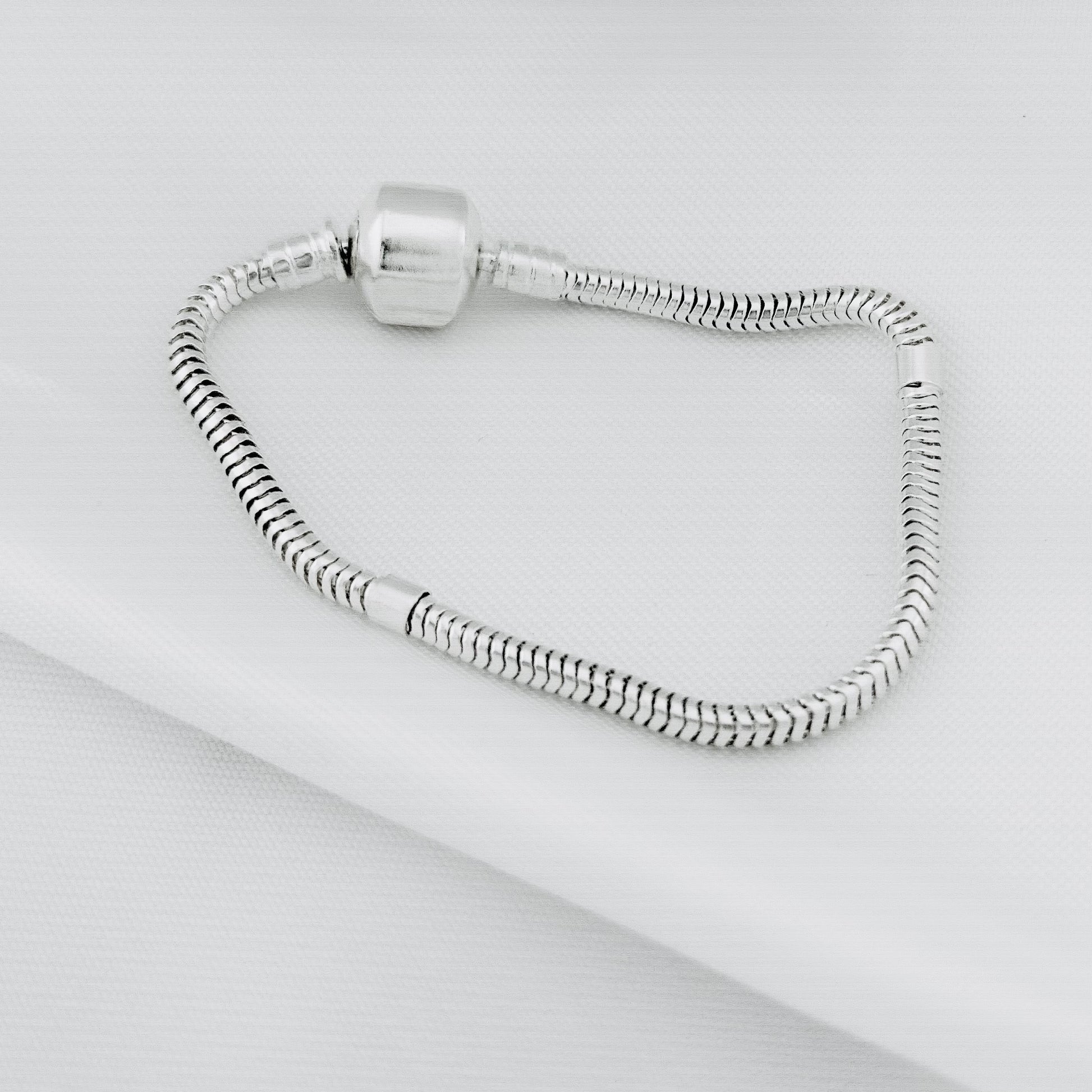 Nuestro Brazalete Cierre de Barril Clásico es la base perfecta para iniciar tu colección de charms. Elaborada en plata ley 925 italiana, esta pulsera de cadena de serpiente destaca por su broche de barril pulido y liso, que le da un toque atemporal y minimalista. Su diseño versátil te permitirá crear una historia única con cada charm que añadas.