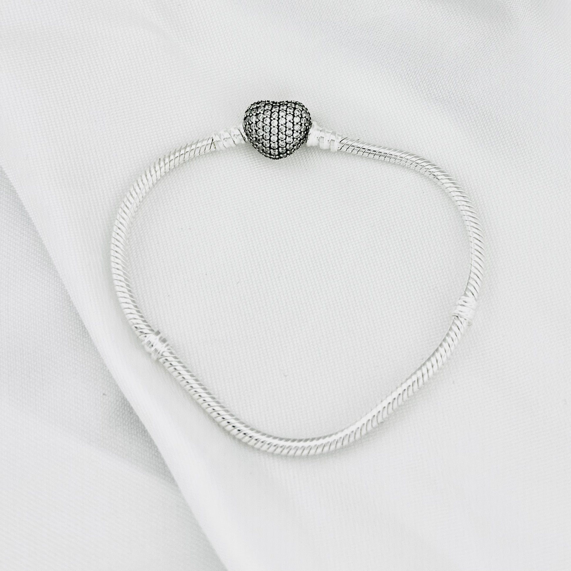 Realza tu estilo con nuestra elegante pulsera de cadena de serpiente, elaborada en plata ley 925 italiana, la base ideal para lucir tus charms favoritos. Su broche en forma de corazón cubierto de pavé de piedras transparentes le da un toque de brillo y romanticismo que la convierte en el accesorio ideal para cualquier ocasión.