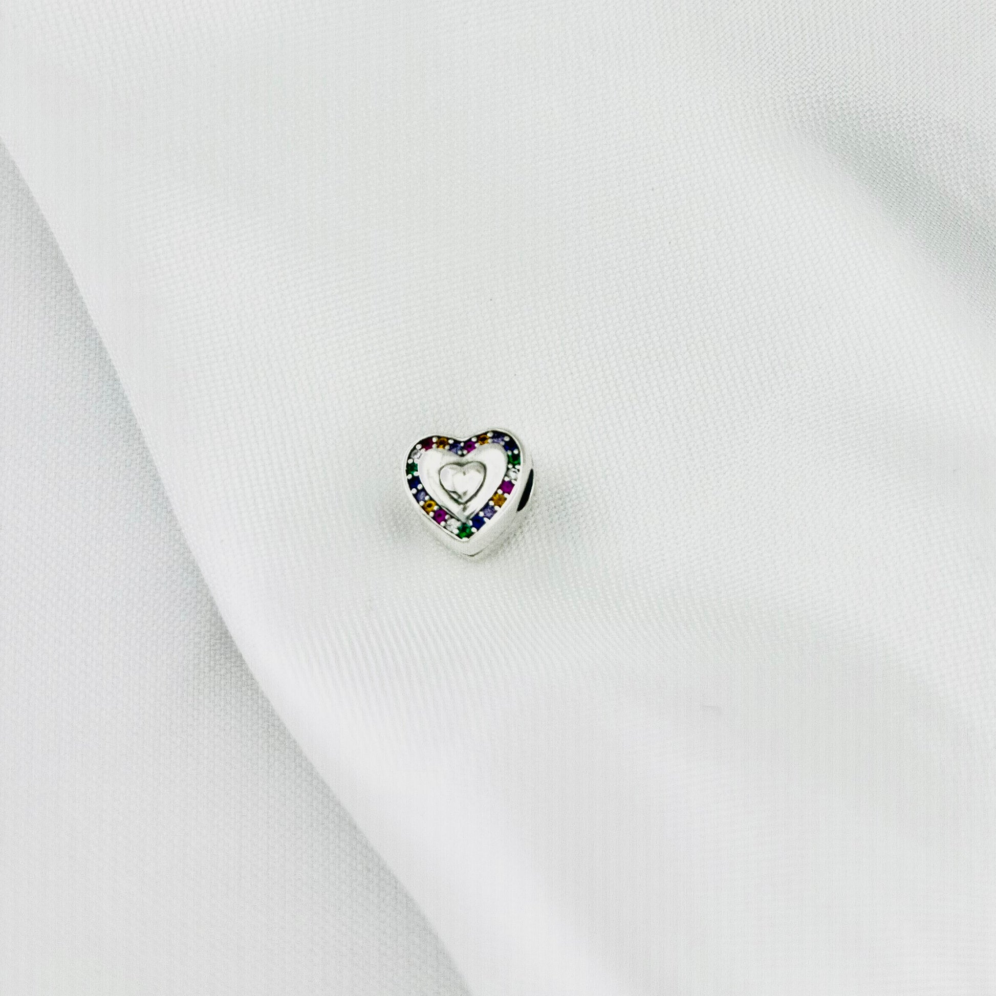 ¡Añade un toque de color y amor a tu pulsera con nuestro Broche Corazón Arcoíris! Este broche de plata, diseñado para funcionar como clip o separador, tiene la forma de un corazón con un diseño de doble corazón. El corazón exterior está adornado con una brillante hilera de piedras de diversos colores, evocando un alegre arcoíris. Es la forma perfecta de asegurar tus charms y expresar tu amor por el color y la diversidad.