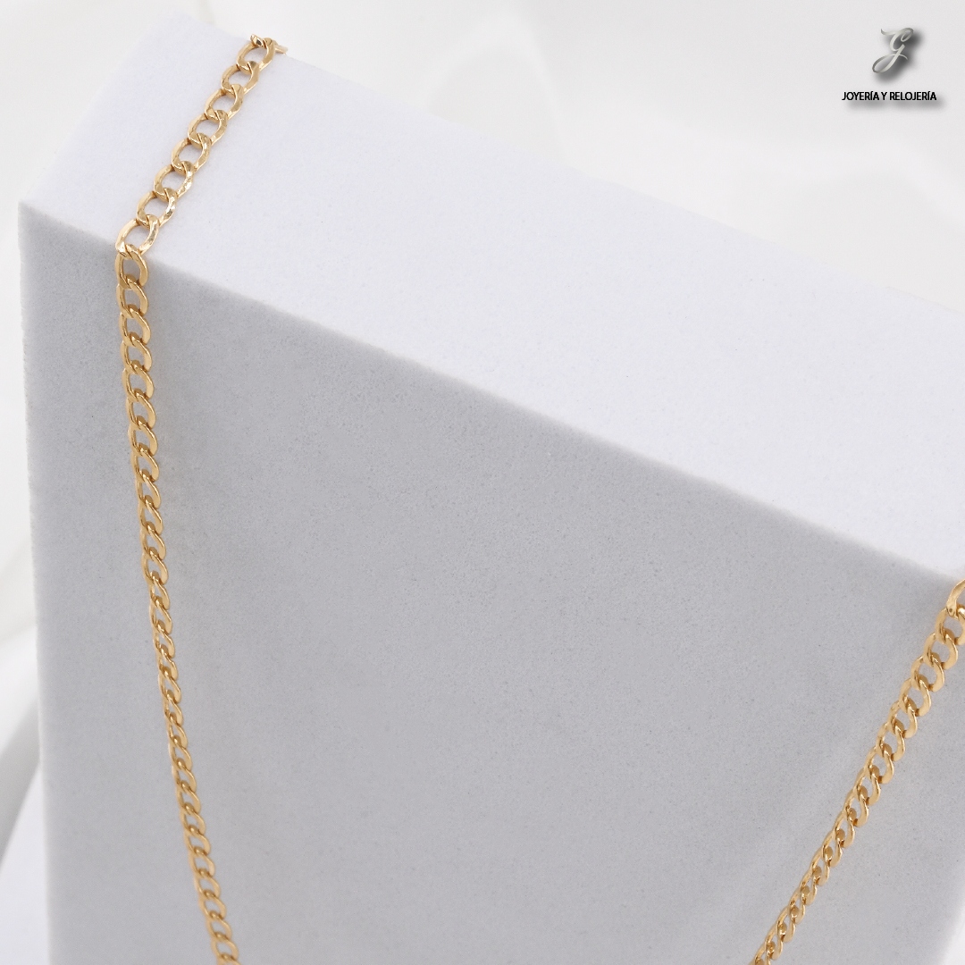 Este tejido se inspira en el clásico Cubano/Barbada, caracterizado por sus eslabones ovalados muy juntos, entrelazados y planos, lo que garantiza que la cadena se asiente suavemente sobre el cuello. Su pulido espejo le confiere un brillo excepcional, y al ser una versión delgada, es perfecta para un estilo discreto y elegante.