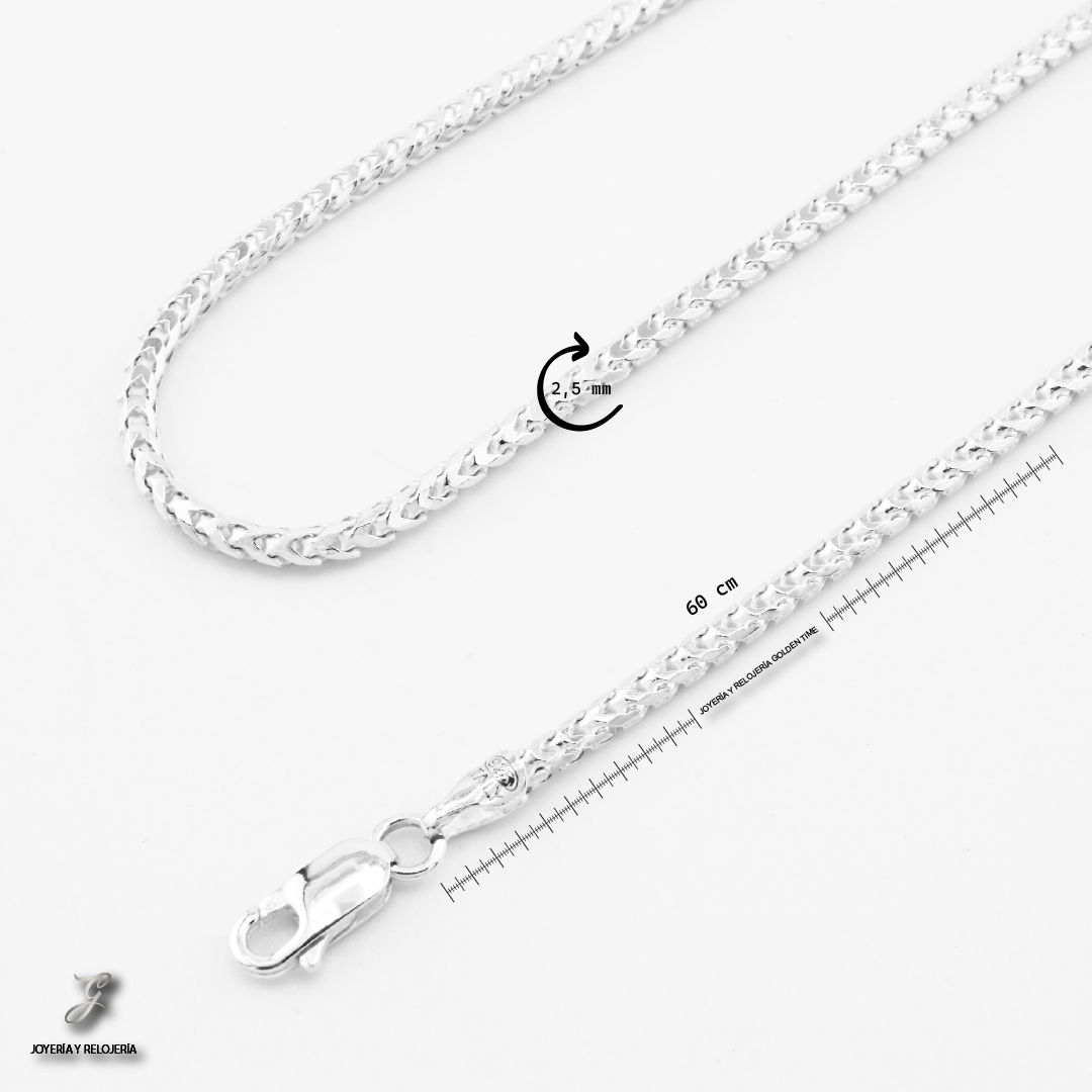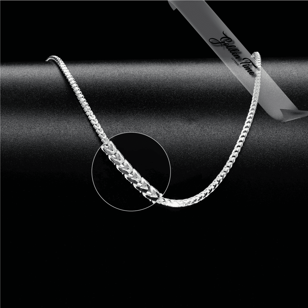 Elegancia y sofisticación se combinan en esta cadena de tejido franco, elaborada en plata italiana 925 de alta pureza. Su diseño entrelazado y robusto ofrece un brillo sutil pero impactante, ideal para quienes buscan una joya clásica con un toque moderno. Perfecta para usar sola o con un dije, esta cadena es un accesorio versátil que realza cualquier estilo, desde el más casual hasta el más formal.
