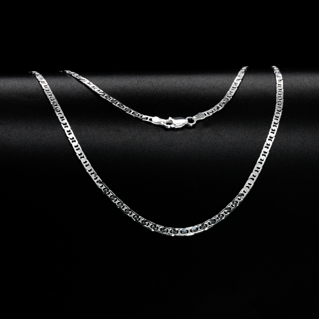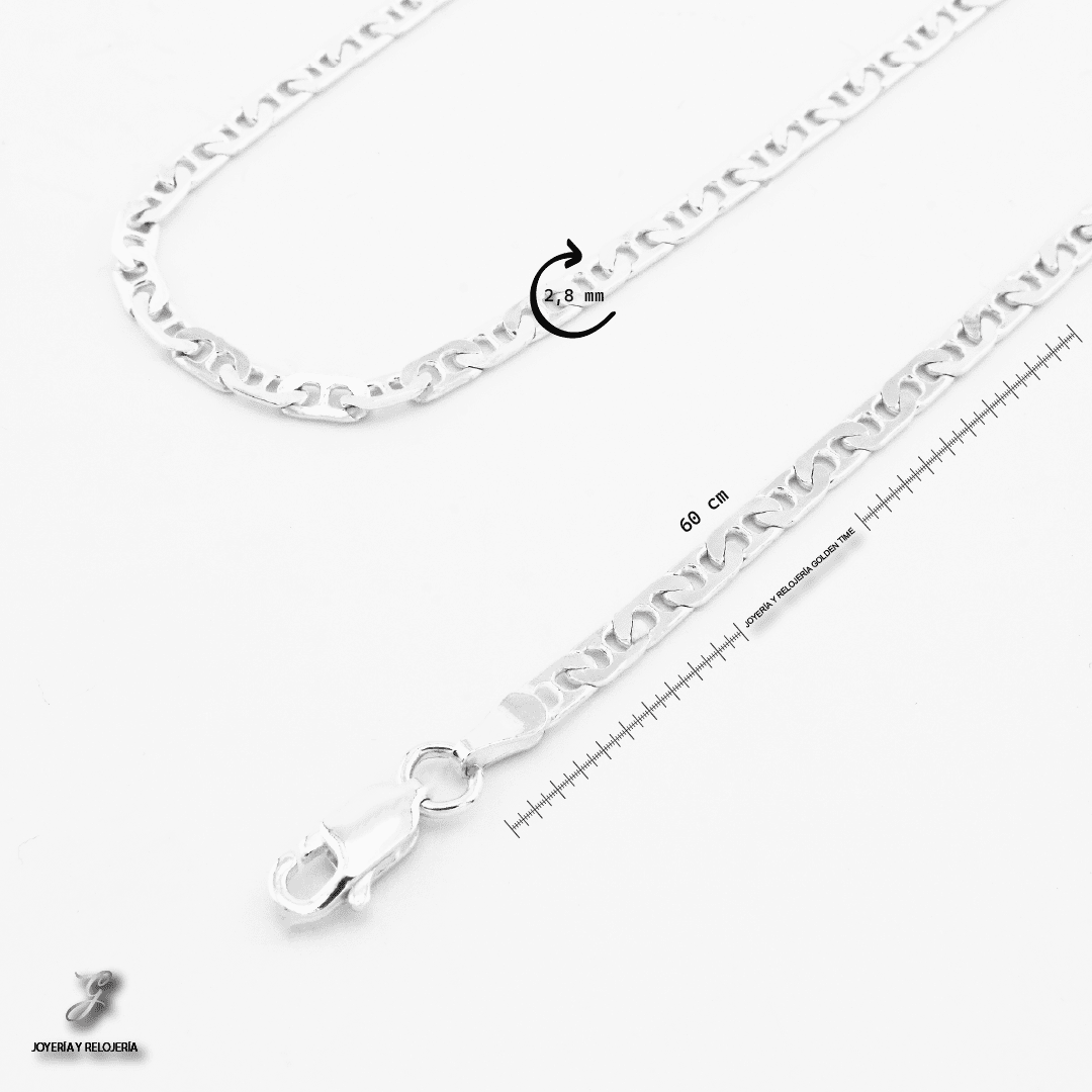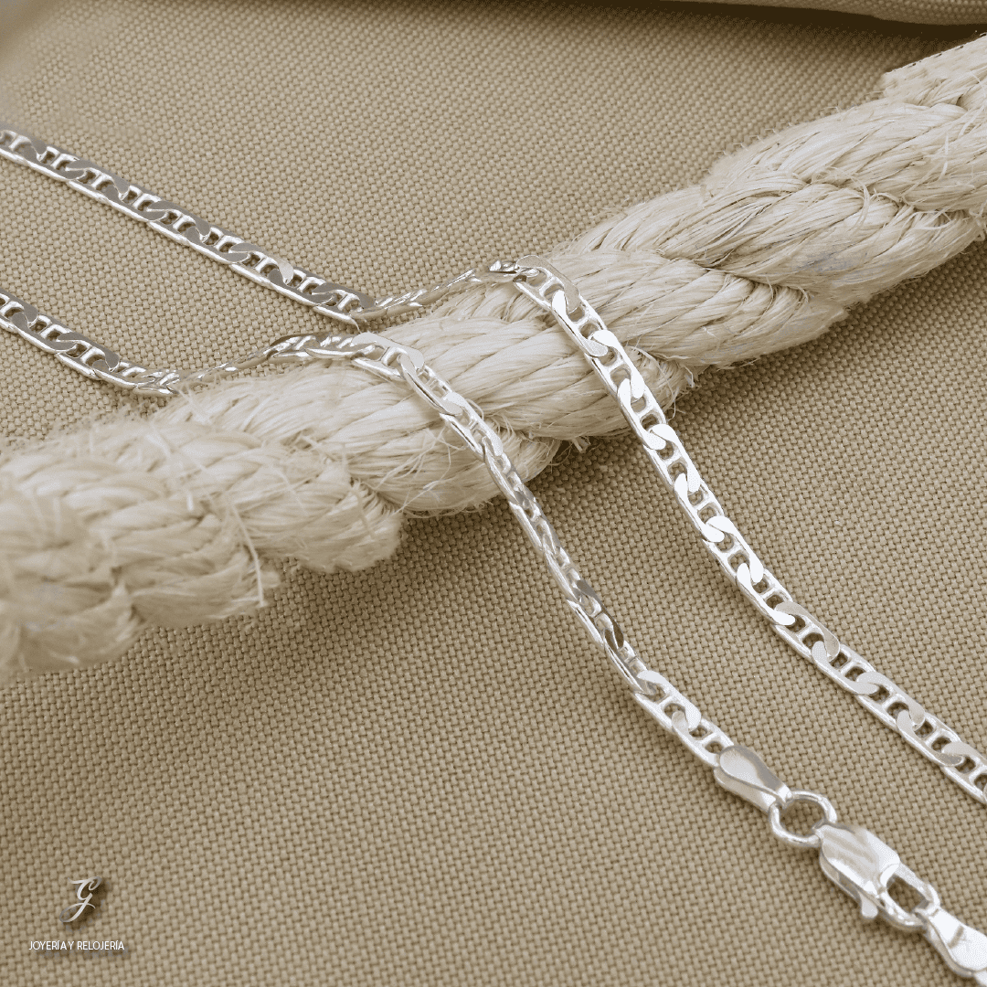 Elegante y resistente, nuestra cadena de plata 925 con tejido marine combina estilo y durabilidad en una joya atemporal. El diseño marine —inspirado en las cadenas náuticas— presenta eslabones ovalados con una barra central, ofreciendo un look sofisticado y moderno. Fabricada en plata esterlina de alta calidad (925), esta cadena es perfecta para usar sola o con un dije.