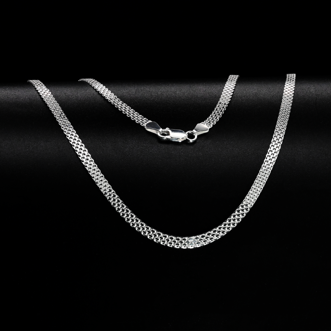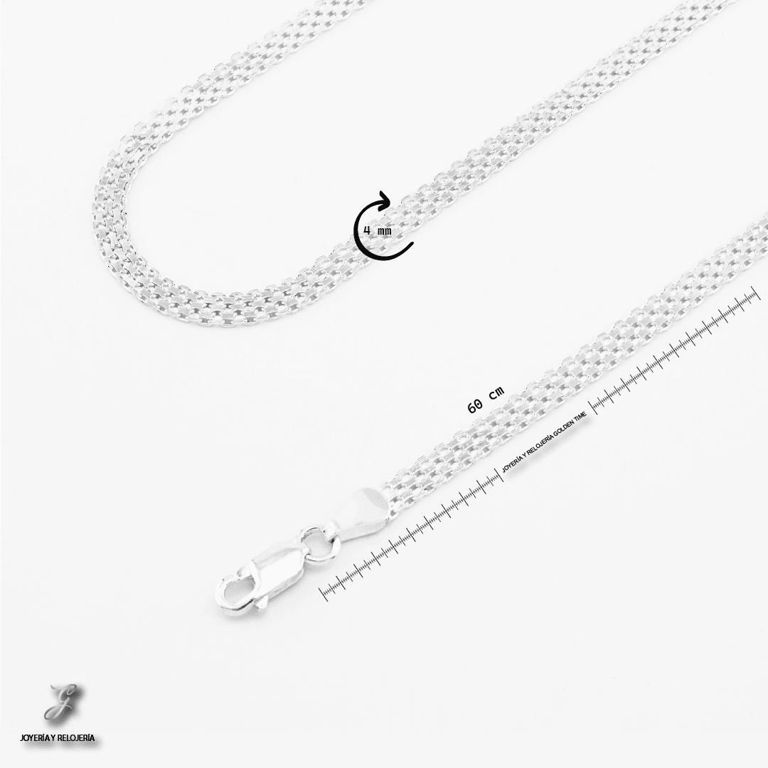 Cadena elaborada en plata italiana 925, compuesta por un 92.5% de plata pura, reconocida por su brillo duradero y alta calidad. El tejido chinesco presenta un diseño característico de eslabones entrelazados en forma de espiral o nudo, inspirado en patrones orientales tradicionales. Este tejido ofrece un estilo distintivo, elegante y con textura, que refleja la luz de manera llamativa. Su estructura sólida y flexible la convierte en una pieza ideal para lucir sola como protagonista o acompañada de un dije, aportando un toque exótico y sofisticado a cualquier atuendo.