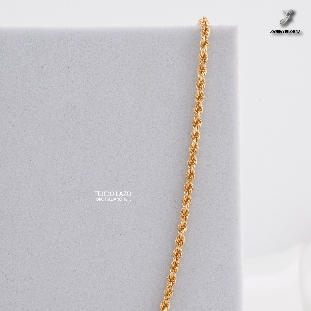 Su distintivo Tejido Lazo (también llamado Cuerda o Soga) se compone de varios hilos o eslabones entrelazados firmemente en un efecto espiral. Este trenzado único le confiere un volumen texturizado, una gran solidez y un brillo excepcional que destella desde cualquier ángulo al moverse. Es un diseño atemporal, unisex y muy apreciado por su carácter imponente. 💎