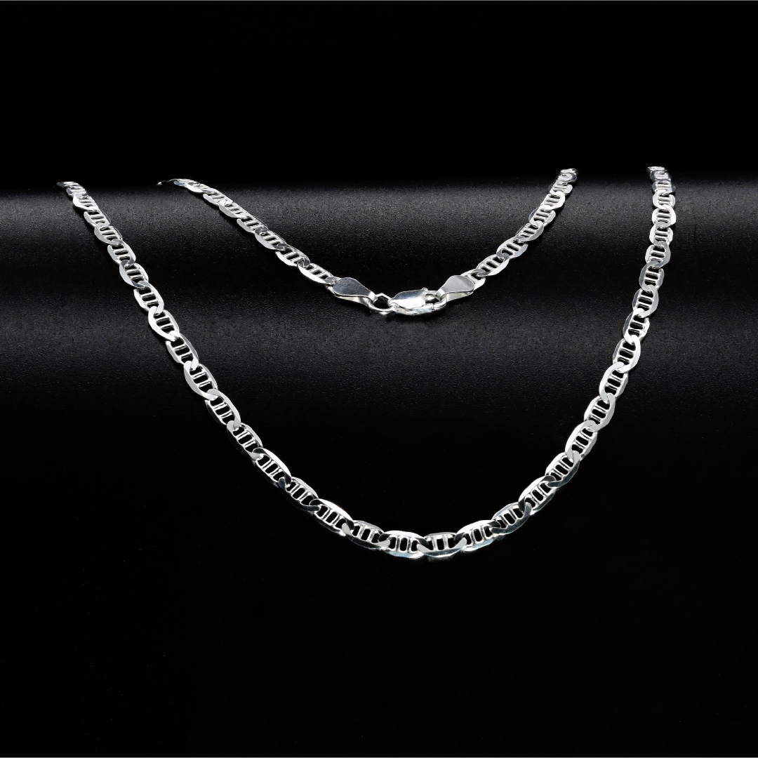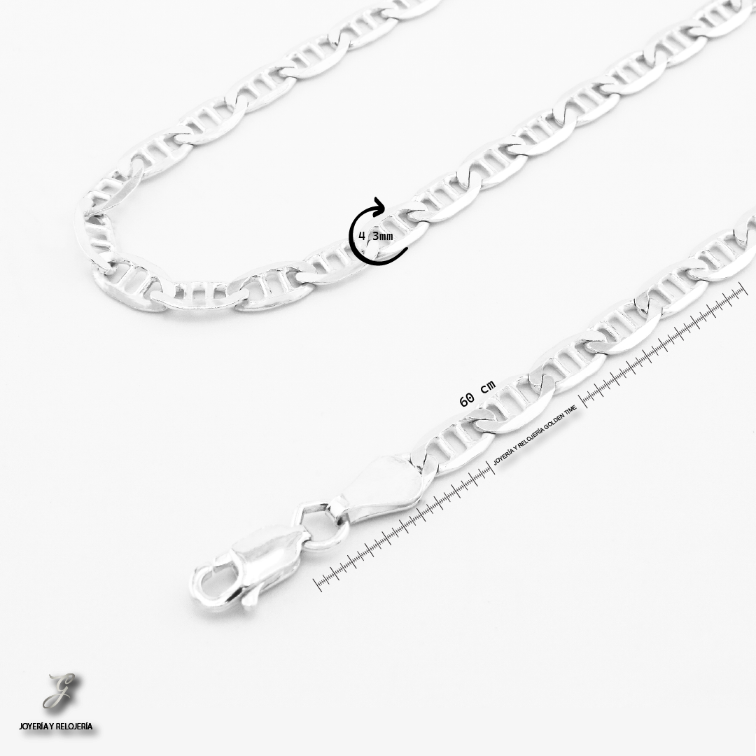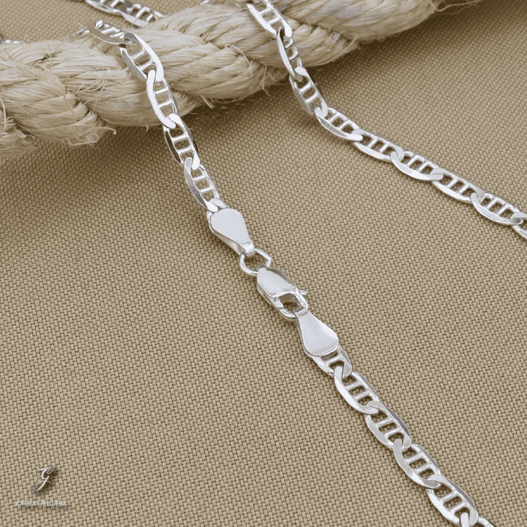 Cadena elaborada en plata italiana 925, reconocida por su alta pureza (92.5% de plata fina) y calidad. Presenta un tejido escalera doble, un diseño distintivo y sofisticado caracterizado por eslabones entrelazados en patrón escalonado doble, que le confieren un brillo elegante y una apariencia robusta pero flexible. Este estilo de cadena es ideal tanto para uso diario como para ocasiones especiales, ya sea como pieza principal o acompañada de un dije.