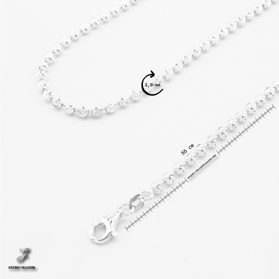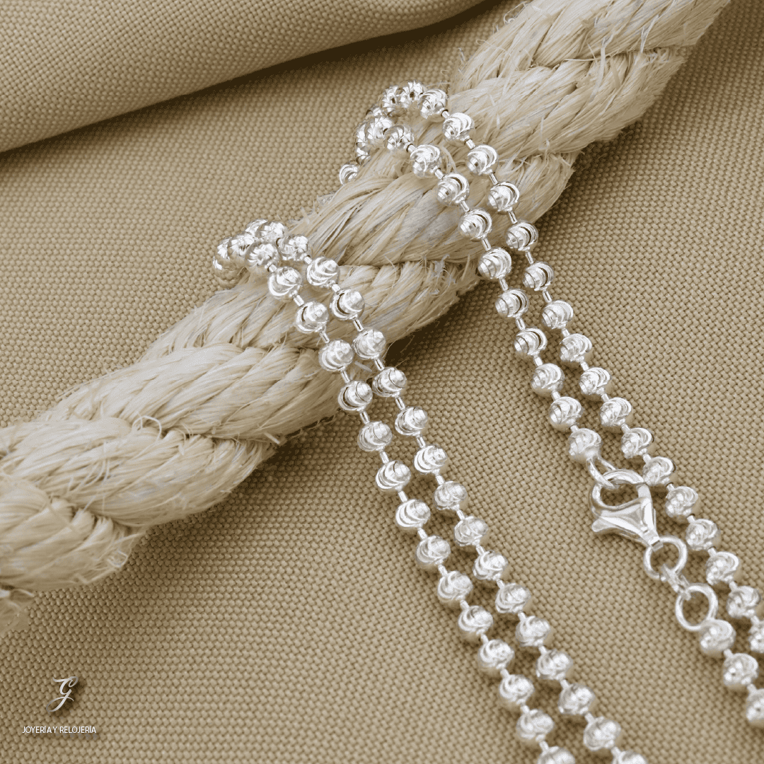 Es una cadena de joyería fina compuesta por pequeñas cuentas o esferas metálicas con un diseño de lunas, dispuestas uniformemente a lo largo de un hilo o alambre de plata italiana 925, que es una aleación de plata compuesta en un 92.5% por plata pura y un 7.5% de otros metales (generalmente cobre) para darle mayor resistencia.
