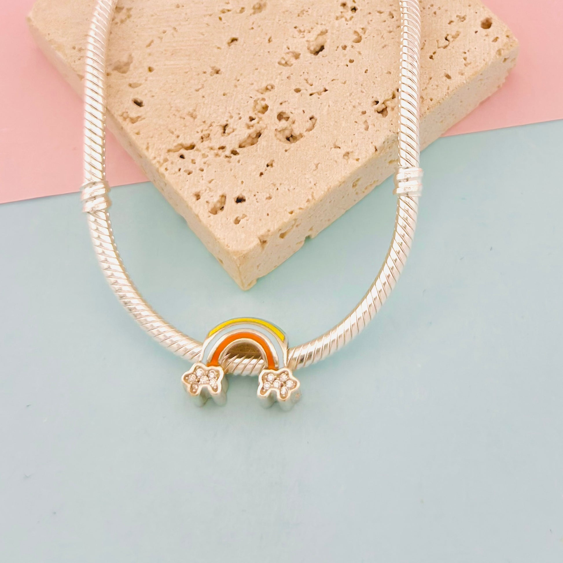 ¡Celebra la diversidad y la alegría con nuestro Charm Arcoíris y Nubes! Este encantador charm de plata captura la magia de un arcoíris con sus franjas de esmalte en tonos suaves y pastel, símbolo de esperanza, inclusión y orgullo LGBT+. Las nubes blancas esmaltadas en sus bases y las estrellas caladas en el arcoíris le dan un toque de fantasía. Es el accesorio perfecto para llevar un recordatorio de que el amor viene en todos los colores.