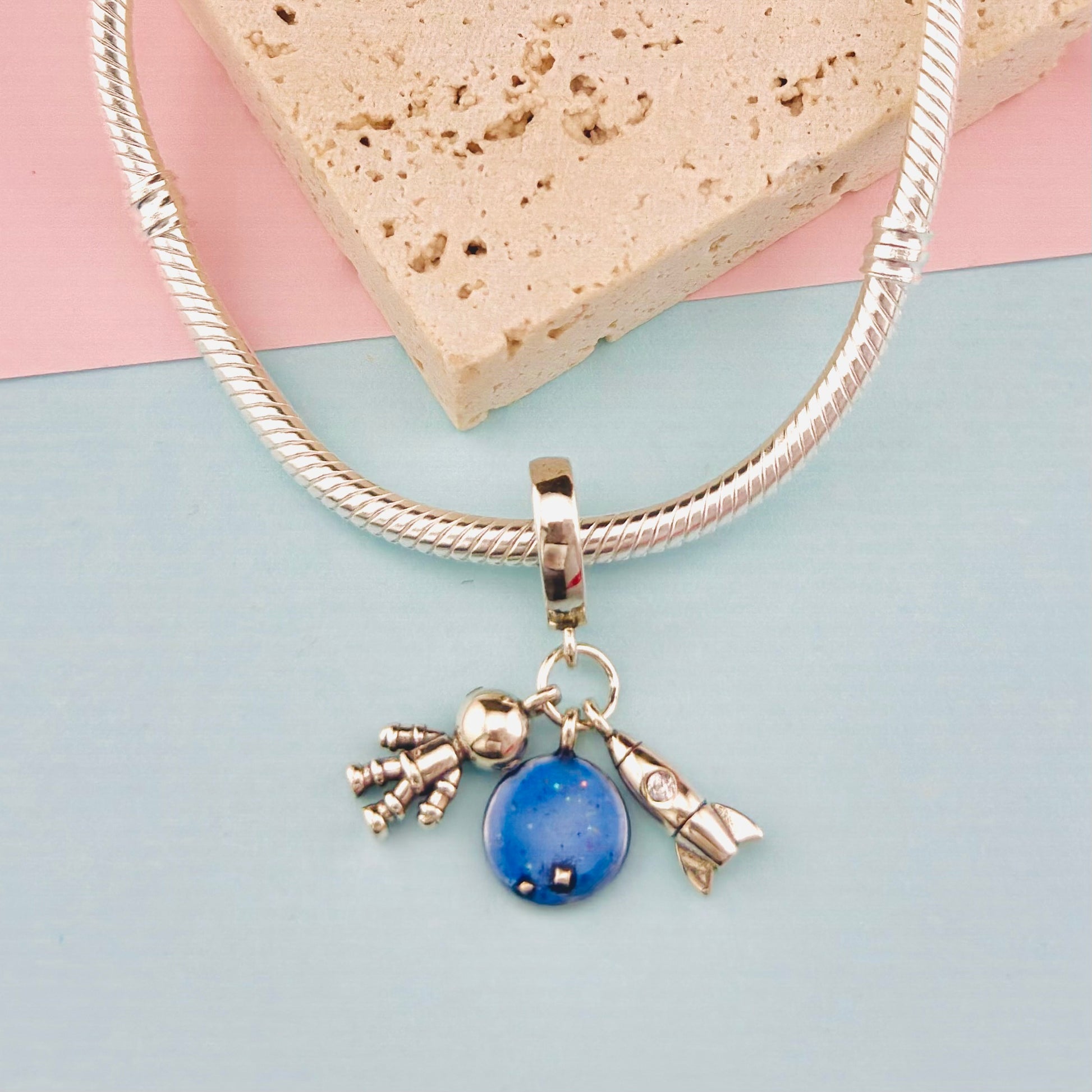 ¡Viaja a las estrellas con nuestro Charm Aventura Cósmica! Este dije triple captura la magia del universo con un astronauta que representa el valor de la exploración, un charm del cosmos con un mundo y estrellas que simboliza la inmensidad del espacio, y un cohete espacial listo para despegar hacia lo desconocido. Es el accesorio perfecto para los soñadores y exploradores que miran al cielo con admiración y sueñan con las estrellas.