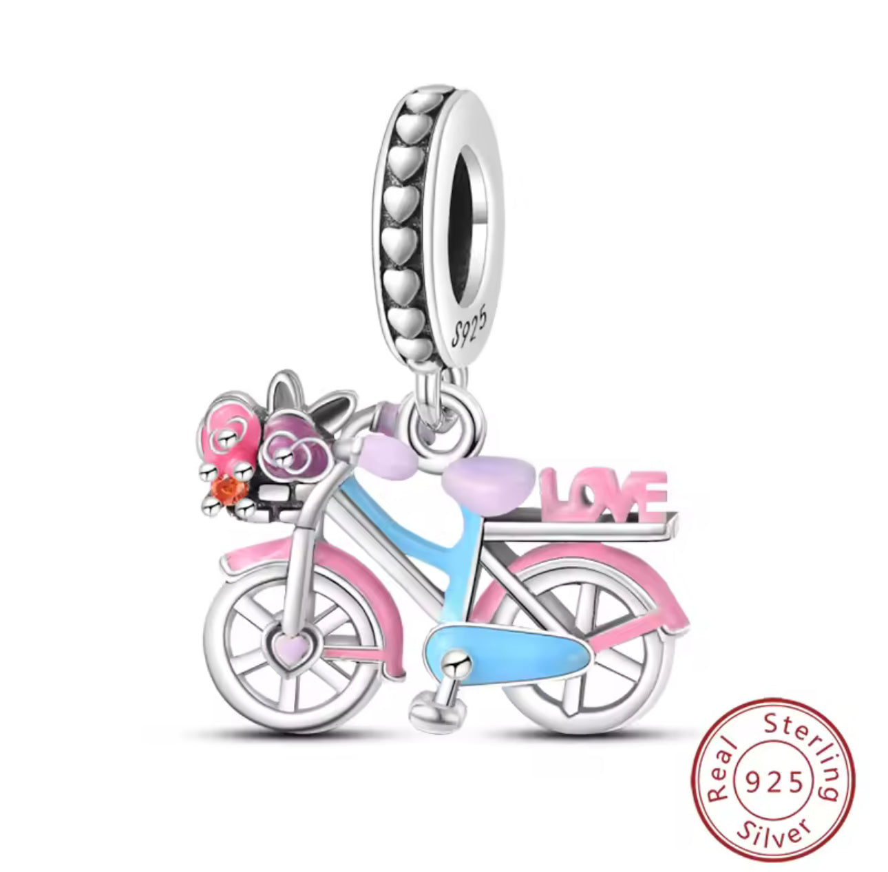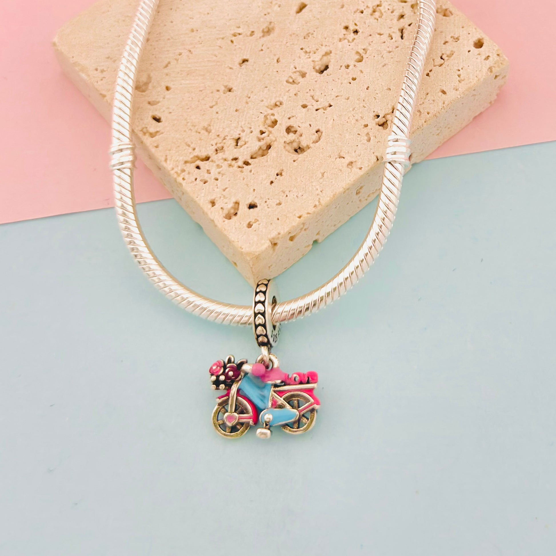 ¡Pedalea hacia la felicidad con nuestro Charm Bicicleta con Flores! Este dije colgante de plata presenta una encantadora bicicleta con detalles en esmalte rosa y azul claro, llevando una cesta llena de flores de colores. Es el accesorio perfecto para celebrar los momentos de libertad, la belleza de la primavera y la alegría de los pequeños viajes.