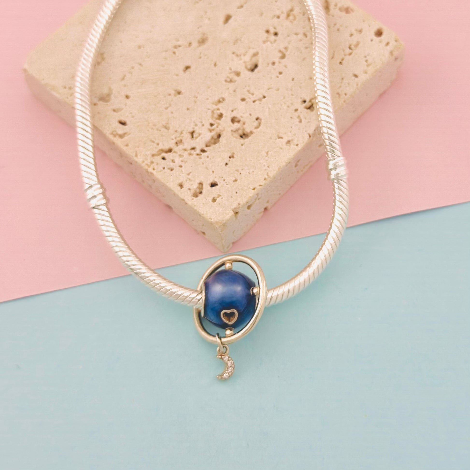 ¡Lleva la magia del universo en tu pulsera con nuestro Charm Cielo Estrellado! Este dije captura la belleza de la noche con una esfera de cristal azul profundo que brilla como un cielo lleno de estrellas. En su centro, un pequeño corazón calado representa el amor que brilla en la oscuridad. De la base cuelga una delicada media luna adornada con pequeñas piedras, simbolizando la esperanza y los sueños. Es el accesorio perfecto para quienes se enamoran del cosmos y la magia de las noches claras.