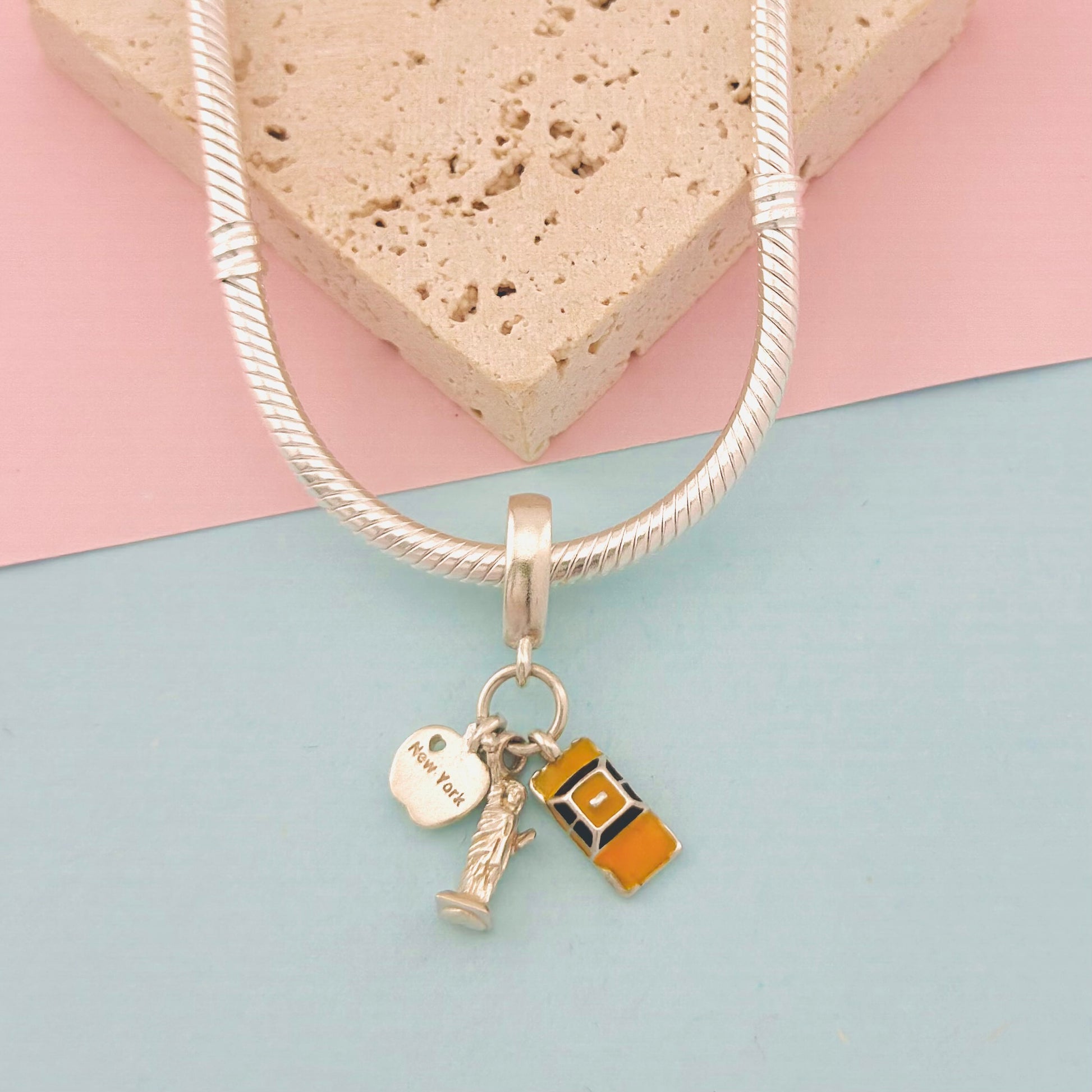 ¡Lleva un pedacito de la Gran Manzana en tu pulsera con nuestro Charm Ciudad de Nueva York! Este dije triple captura el espíritu vibrante de la ciudad con sus íconos más reconocibles: la Estatua de la Libertad, un taxi amarillo y un dije en forma de manzana que dice "New York". Es el accesorio perfecto para viajeros, amantes de la metrópolis y quienes sueñan con las luces y la energía de la ciudad que nunca duerme.