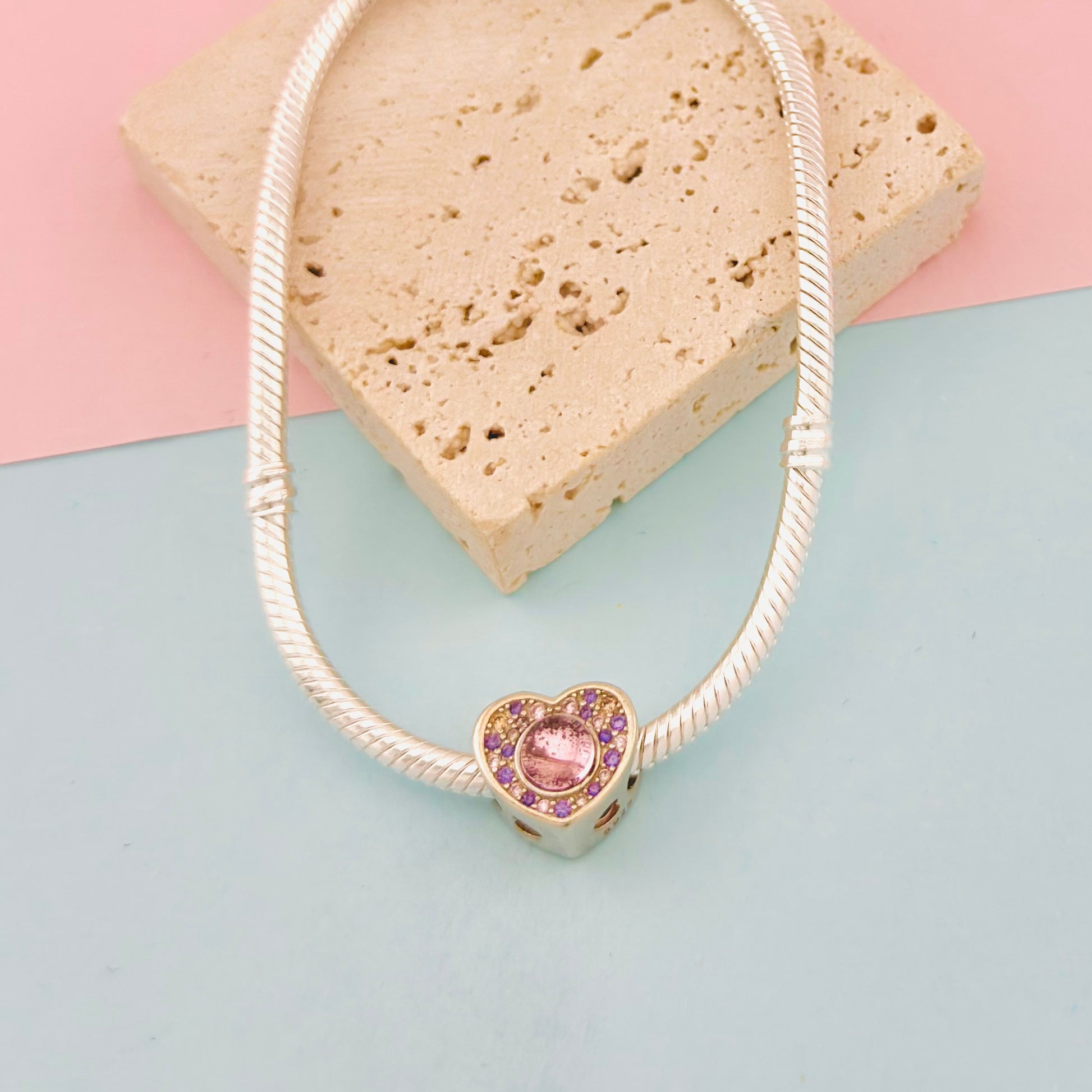 ¡Deja que tu amor brille con nuestro Charm Corazón Brillante! Este dije de plata en forma de corazón destaca por su gran cristal central de color rosa, rodeado de una halo de pequeñas piedras brillantes en tonos rosa y púrpura. Sus detalles calados en los laterales le dan un toque de ligereza y sofisticación. Es el accesorio perfecto para celebrar el amor, la amistad o un momento especial, añadiendo un toque de color y luz a tu pulsera.
