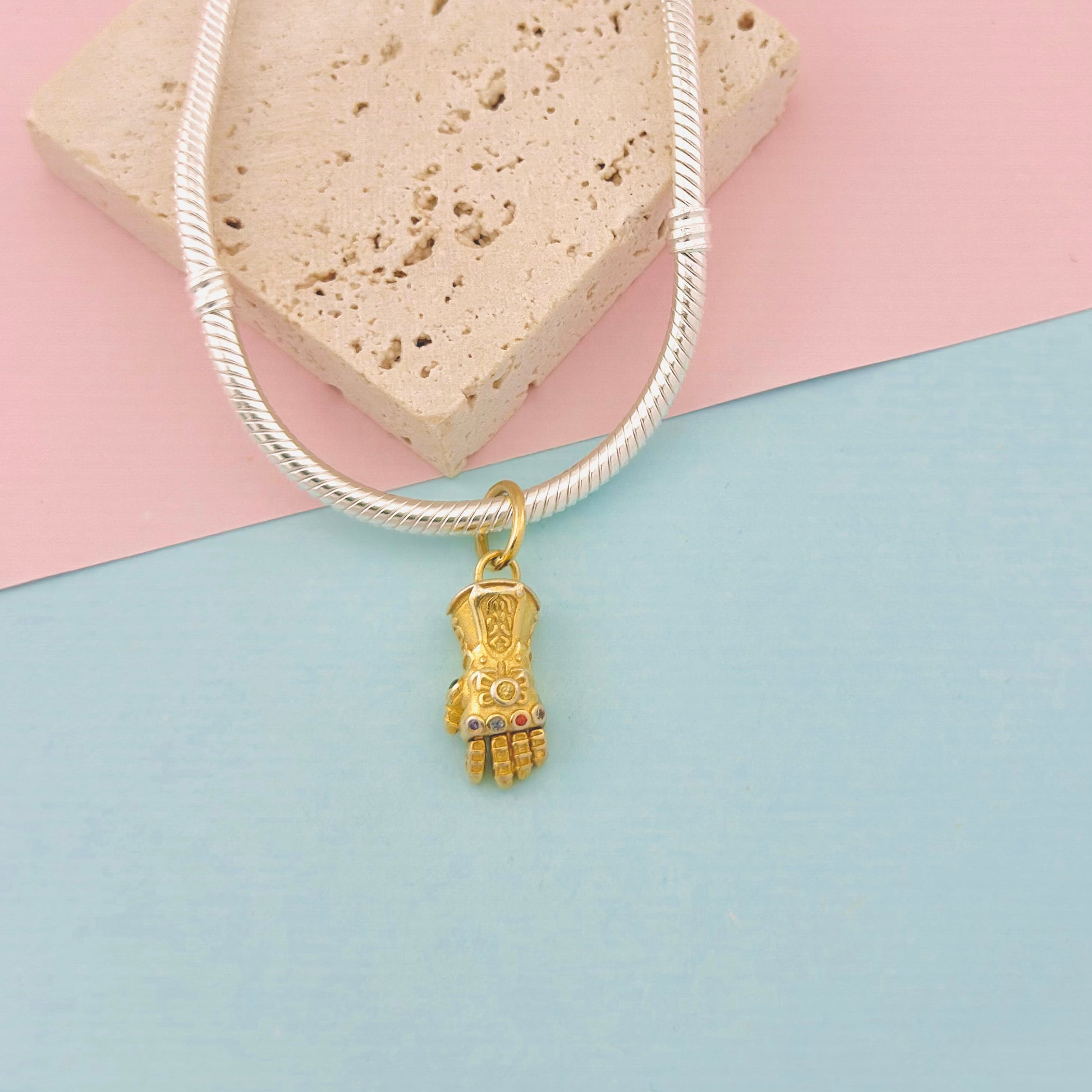 ¡Domina el universo de tu pulsera con nuestro Charm Guante del Poder! Este dije captura el icónico guante de Thanos, con cada una de las gemas del infinito en su lugar. Un brillante baño de oro resalta el poder y el detalle de esta pieza, haciéndola un accesorio irresistible para cualquier fan. Es el símbolo definitivo de fuerza, destino y de la inmensidad del universo Marvel.