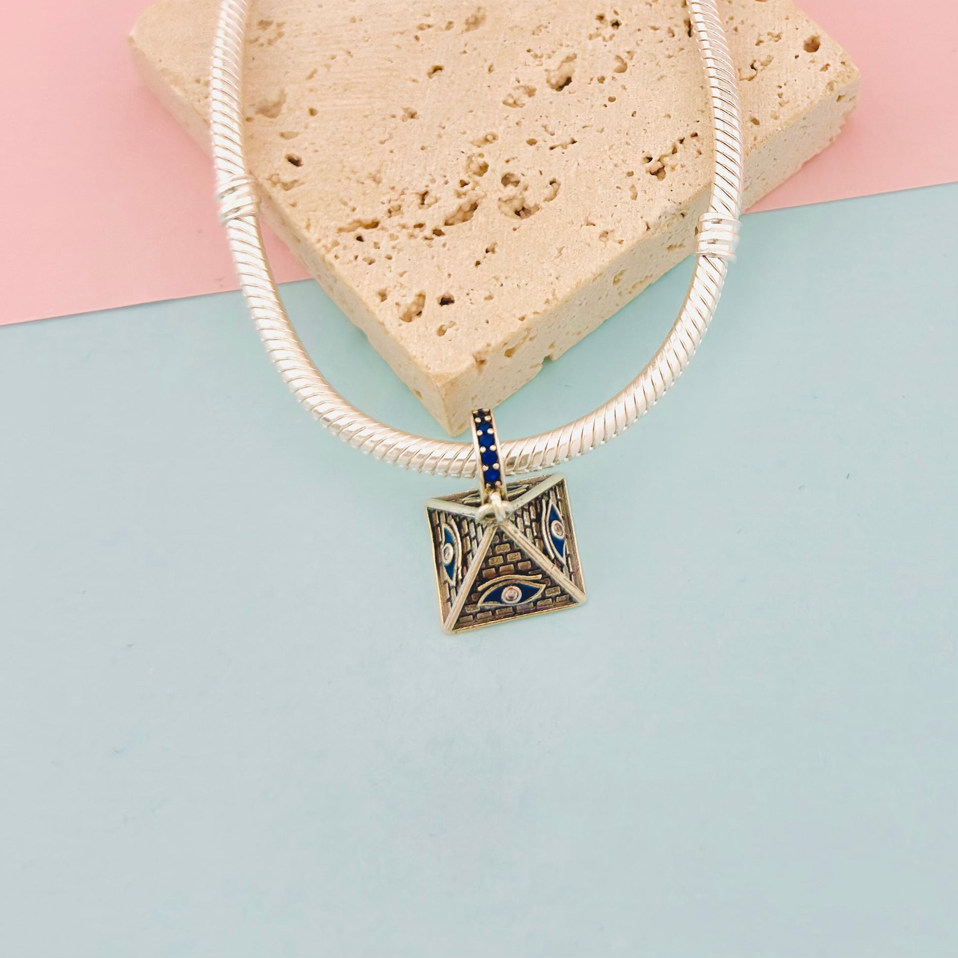 ¡Invoca la protección y el misterio de los antiguos con nuestro Charm Pirámide con Ojo! Este dije colgante tiene la forma de una pirámide detallada, con un simbólico Ojo que todo lo ve en cada lado para ahuyentar las malas energías. La anilla que lo sostiene está adornada con una fila de brillantes cristales azules, añadiendo un toque de color y misticismo. Es el amuleto perfecto para quienes buscan sabiduría y protección en su día a día.