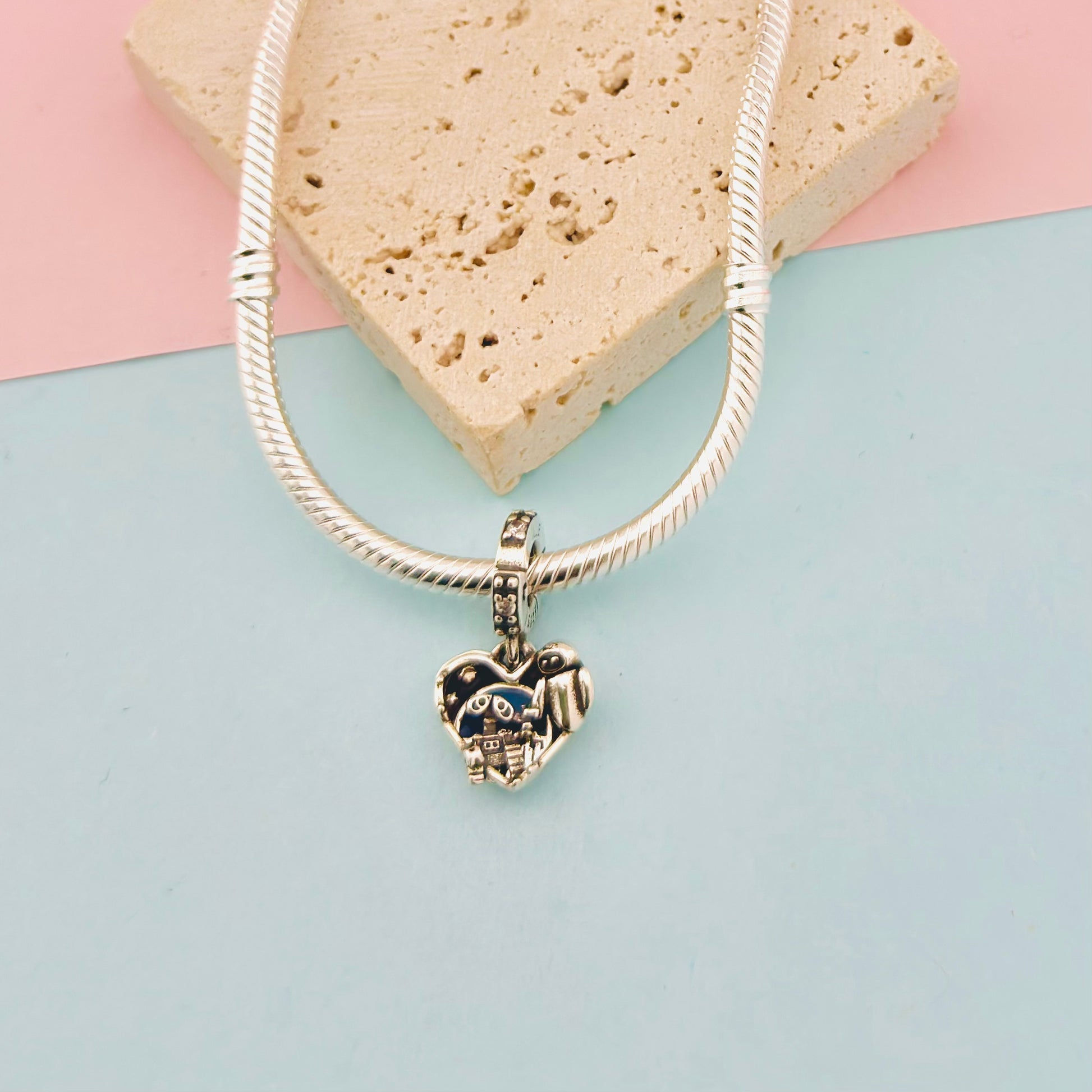 ¡Celebra el amor en el espacio con nuestro Charm Wall-E y Eva! Este adorable dije colgante de plata presenta a los entrañables robots de Disney Pixar abrazándose dentro de un corazón esmaltado con los colores del universo. Es un símbolo del amor puro, la amistad y la aventura que trasciende galaxias.
