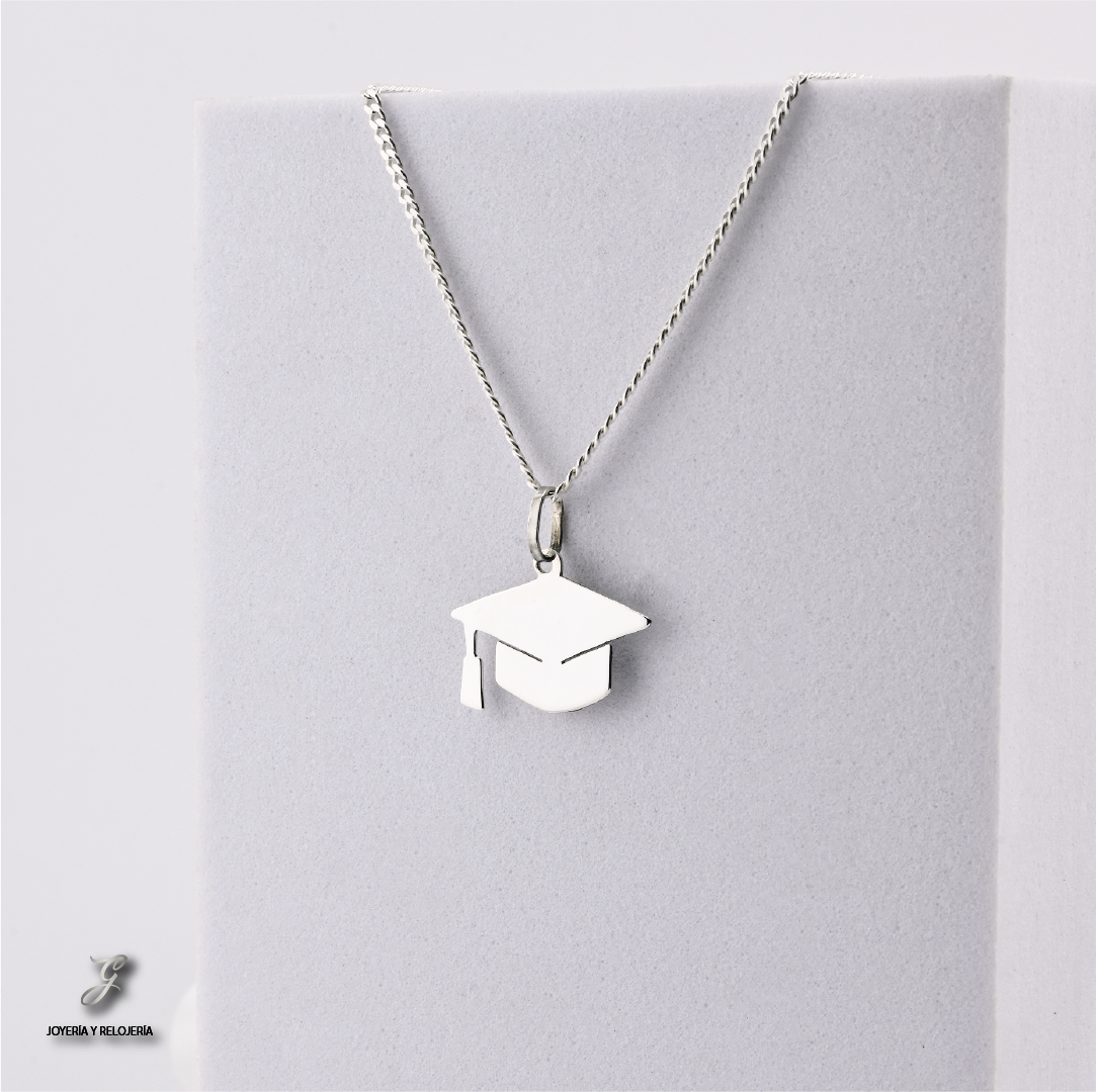 El diseño captura la icónica forma de un birrete de graduación, un emblema de triunfo y de un futuro prometedor. La superficie lisa y pulida de la plata refleja la luz, haciendo de este dije un accesorio elegante y significativo para llevar a diario o en ocasiones especiales. 💎