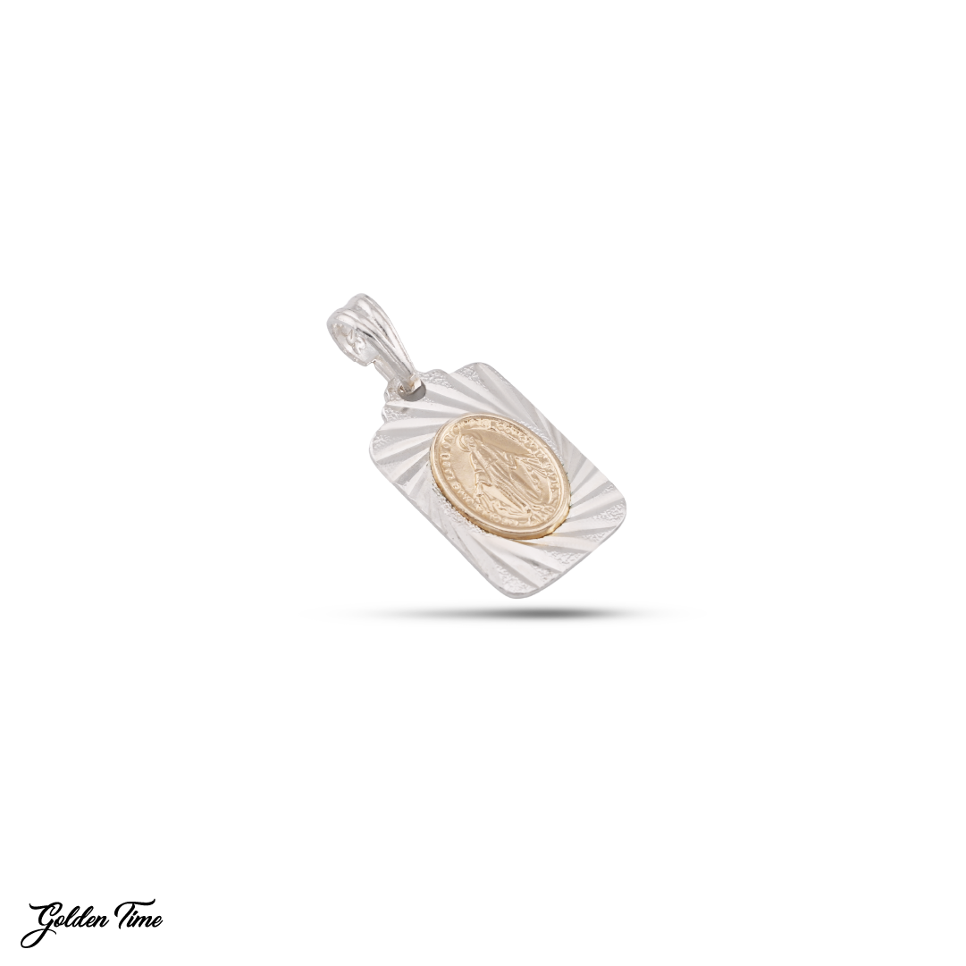 Este diseño rectangular presenta la imagen de la Medalla Milagrosa en un acabado dorado en relieve, destacándose sobre un fondo plateado texturizado que aporta luminosidad y un estilo juvenil. Su forma limpia y su contraste de tonos lo convierten en una pieza perfecta para el día a día.