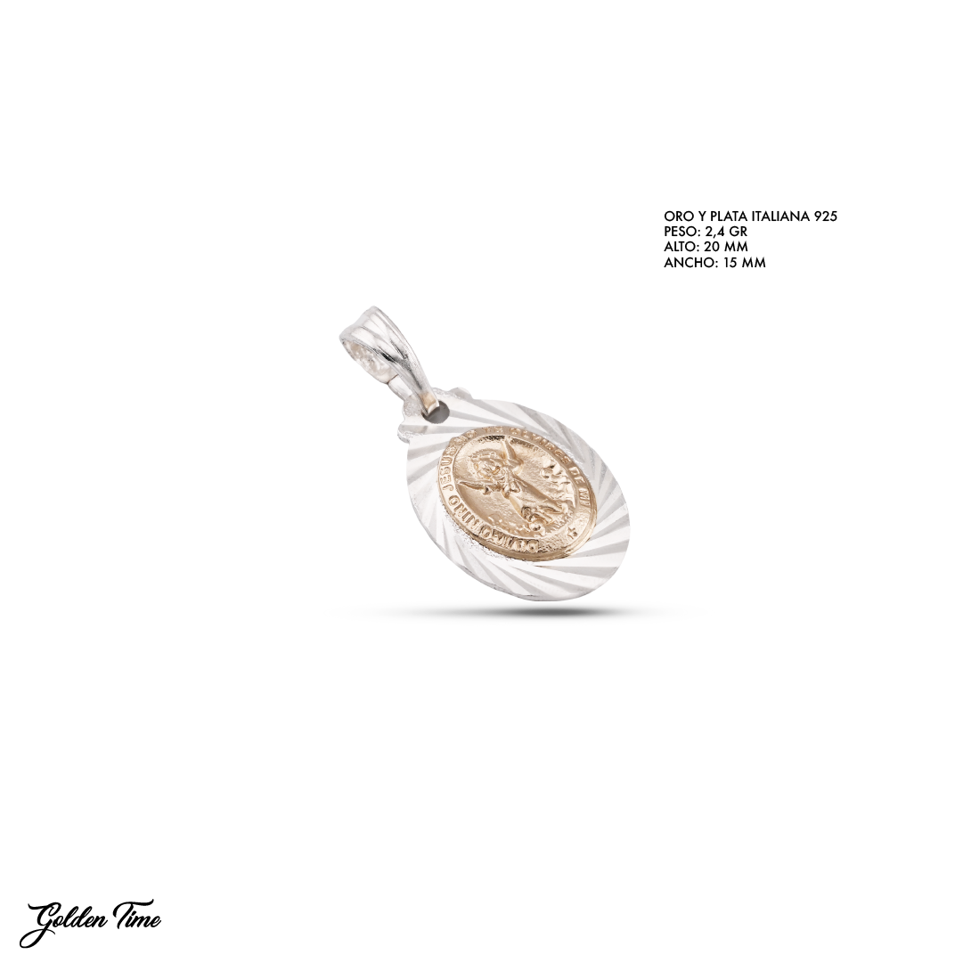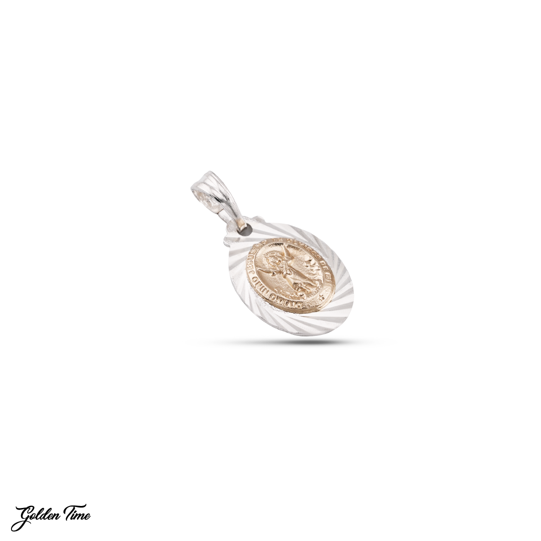 El dije está elaborado en Oro y Plata Italiana 925, donde el detalle central en lámina de Oro 18k aporta un contraste radiante que resalta cada parte del diseño.