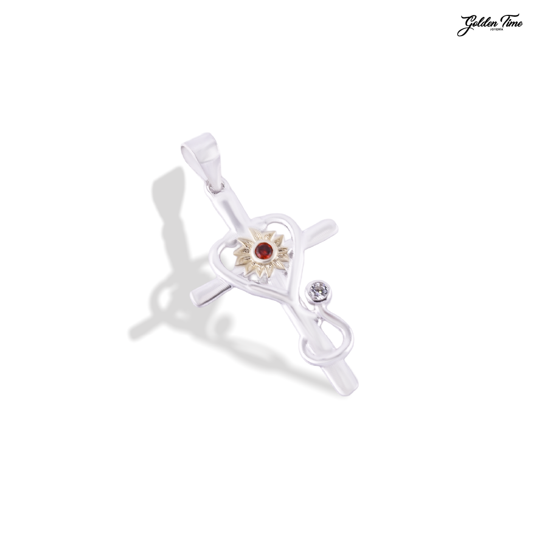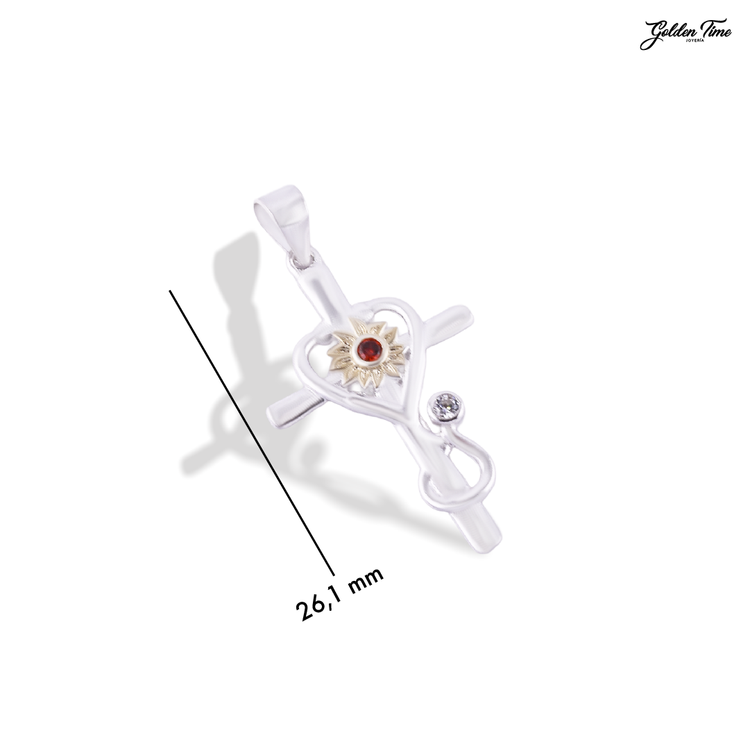 Elaborado en Plata Ley 925, el dije destaca por sus detalles en tono dorado que realzan el girasol, cuyo centro está engastado con un vibrante Circón Suizo de color rojo. La estructura de la cruz, de brazos pulidos y minimalistas, se complementa con un segundo circón blanco de talla Circular en el extremo del fonendoscopio, creando un equilibrio perfecto entre simbolismo y brillo.