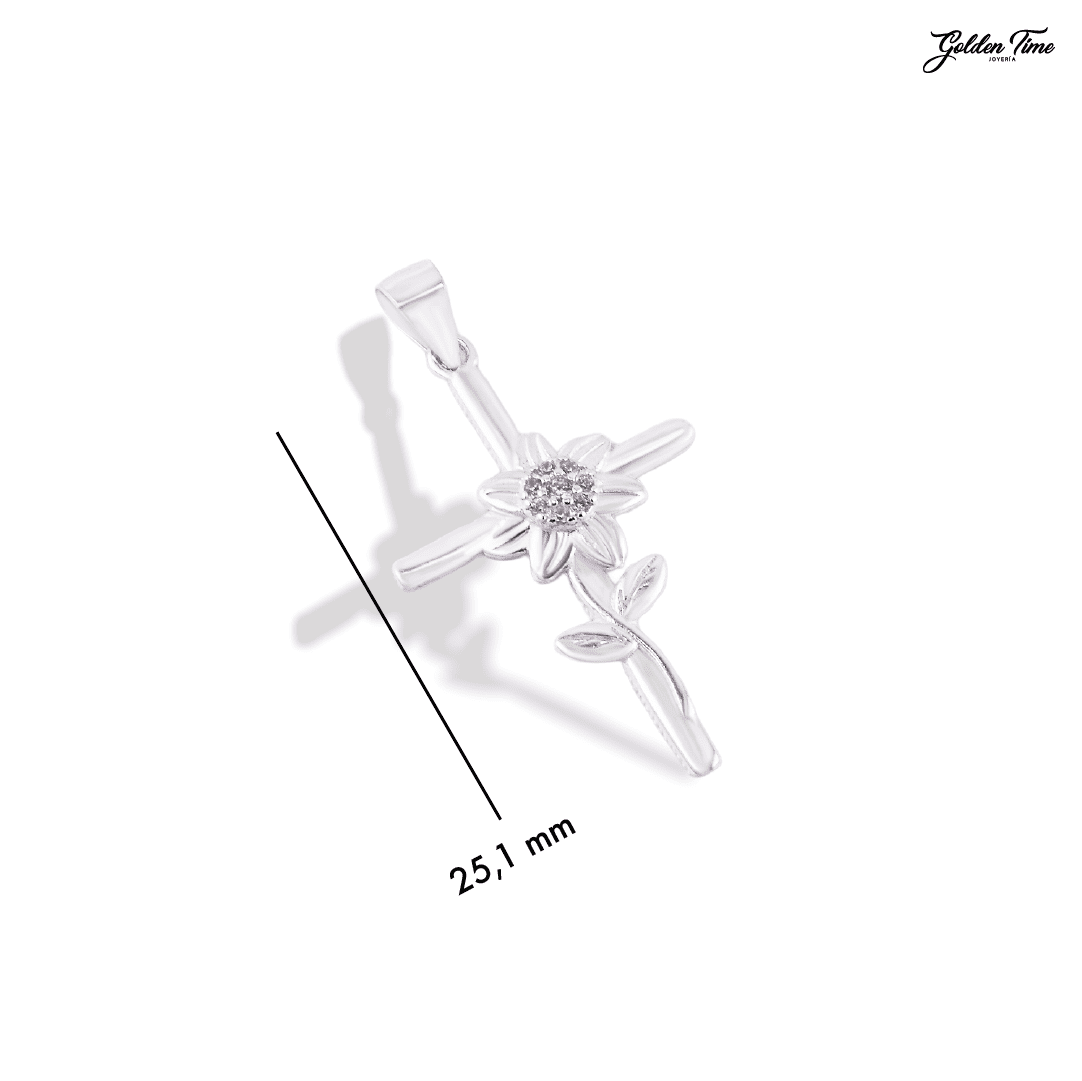 Elaborado en Plata Ley 925, la joya presenta una cruz de brazos lisos y pulidos de la cual brota un girasol con delicados pétalos en baño dorado. El centro de la flor está engastado con un Circón Suizo de talla Circular, aportando un destello de luz que simboliza la energía y la vida. Es una pieza que equilibra la sobriedad del metal noble con el color de la primavera.