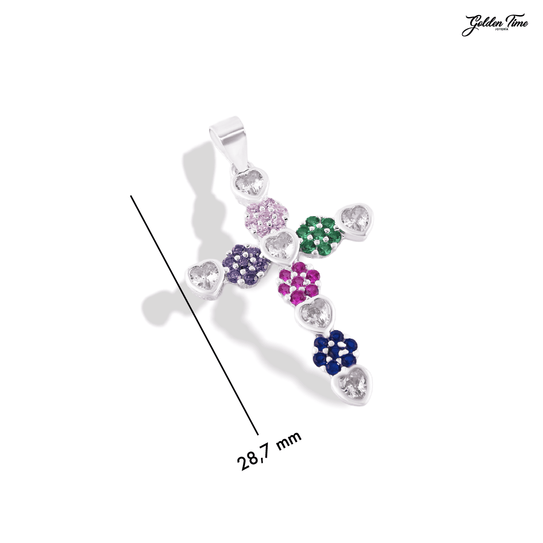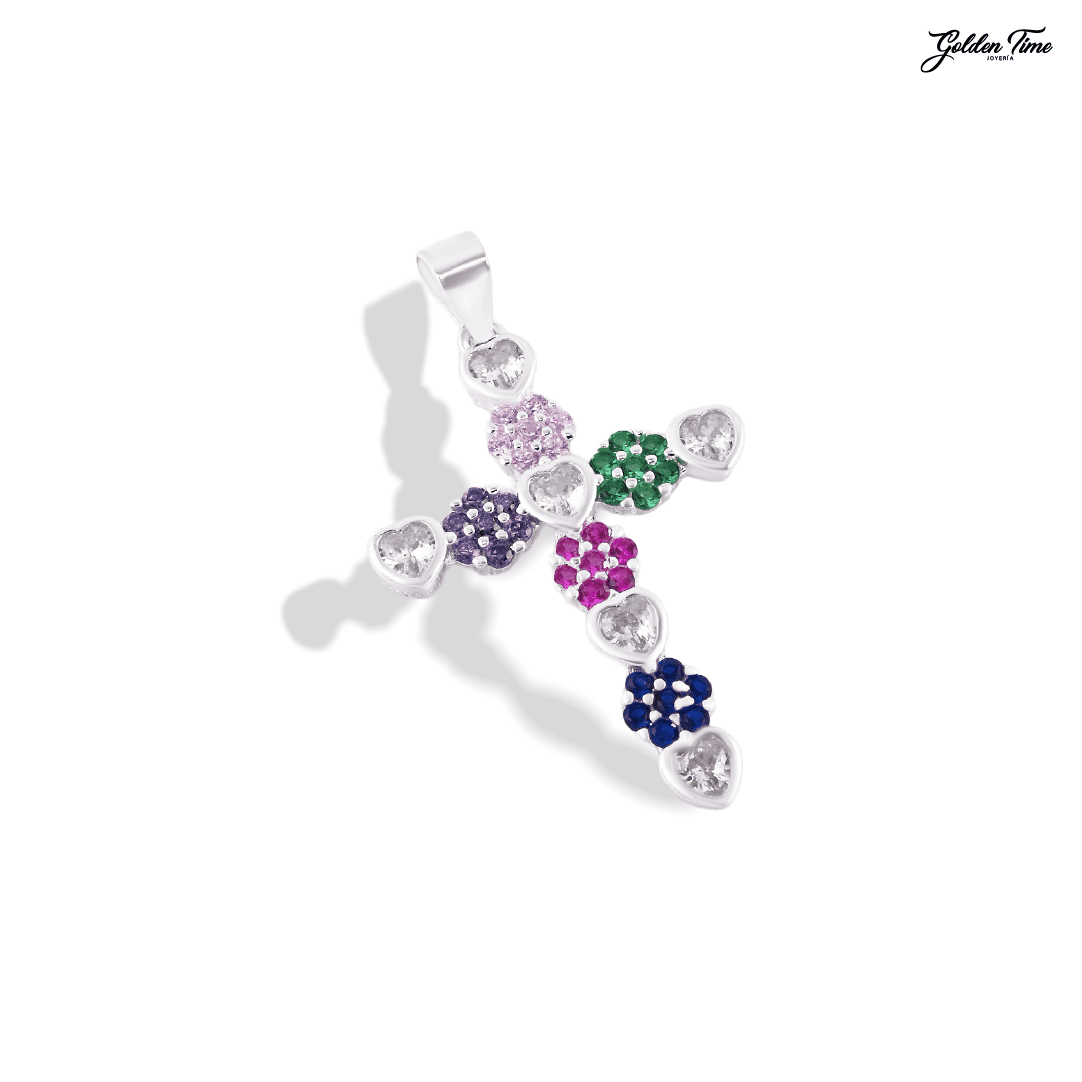 Elaborada totalmente en Plata Ley 925, la cruz está compuesta por una sucesión de figuras entrelazadas: flores y corazones que dan forma a su estructura única. Cada elemento está meticulosamente decorado con Circones Suizos de talla Circular en una amplia gama de colores (rosa, verde, fucsia, azul y violeta), mientras que los corazones brillan con piedras blancas, creando un contraste espectacular y lleno de vida.