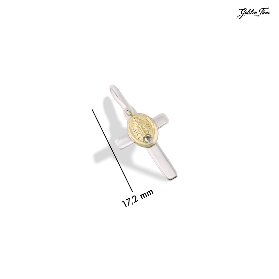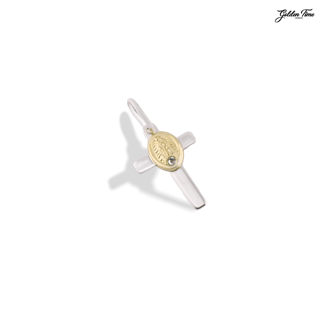 Elaborado en Plata Ley 925, la joya destaca por su silueta de cruz de brazos anchos y pulidos, sobre la cual se superpone la imagen detallada de la Virgen en Lámina de Oro 18K. En el centro de la figura, un Circoncito Suizo de talla Circular aporta un punto de luz divina, creando un contraste majestuoso entre la plata, el oro y el brillo de la piedra.