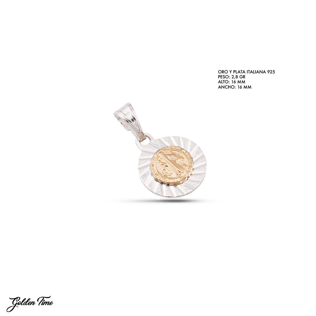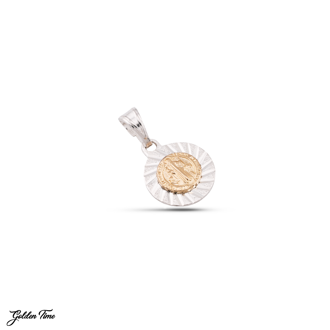 Este diseño circular presenta la medalla de San Benito en un acabado dorado en relieve, rodeada por una placa plateada con textura radial tipo sol que refleja la luz y crea un efecto juvenil y llamativo. Su forma simétrica y su acabado brillante lo hacen perfecto para uso diario con intención espiritual.