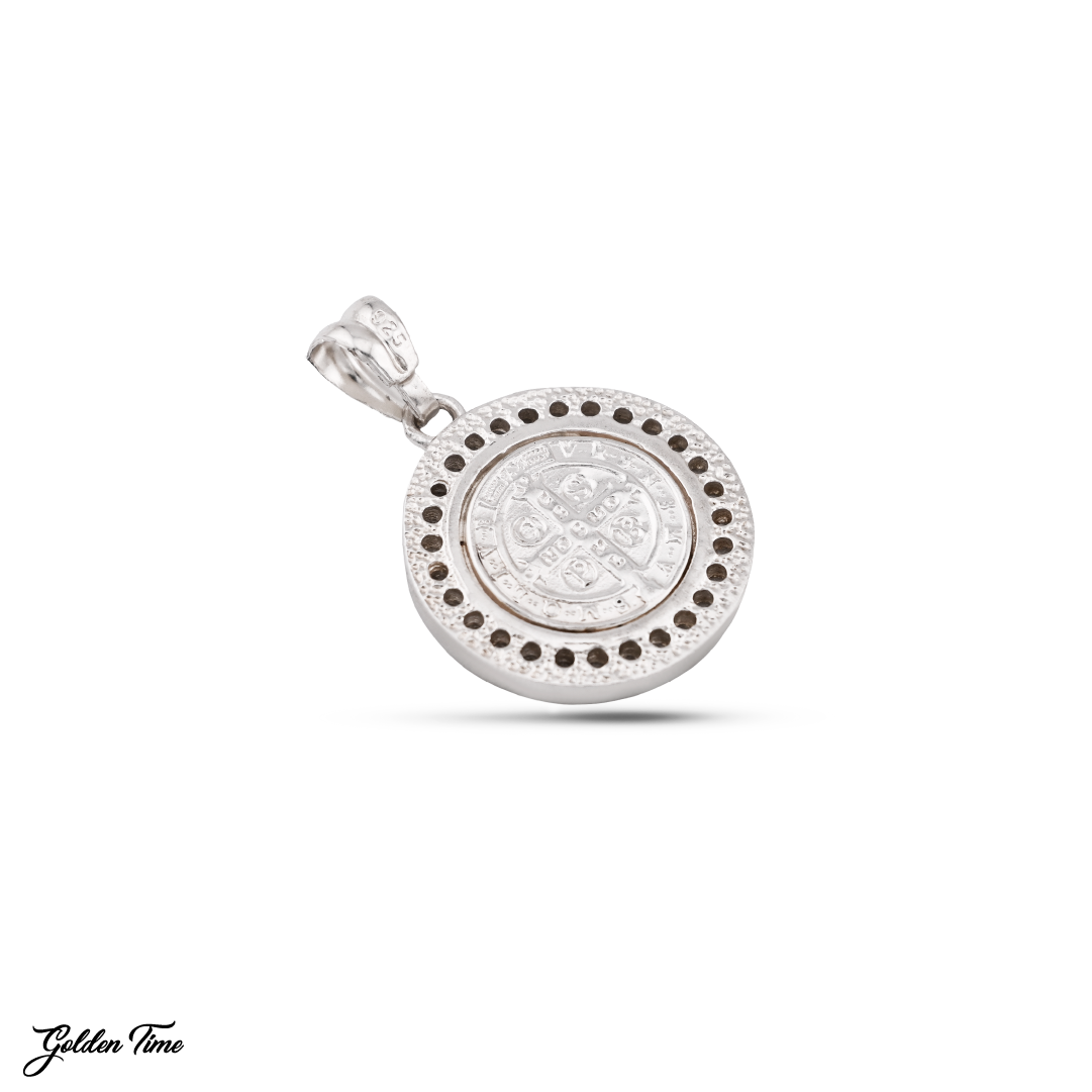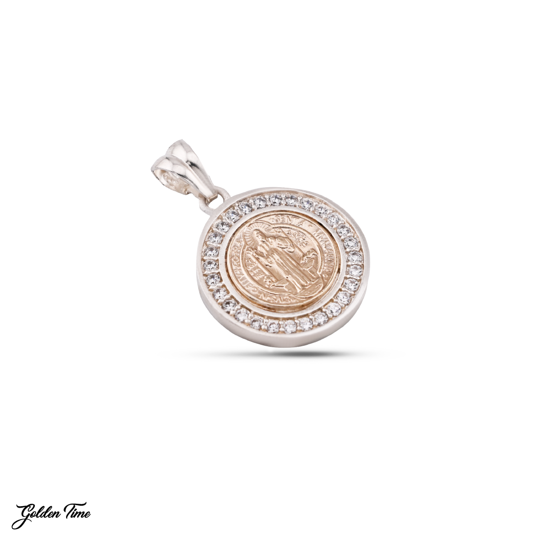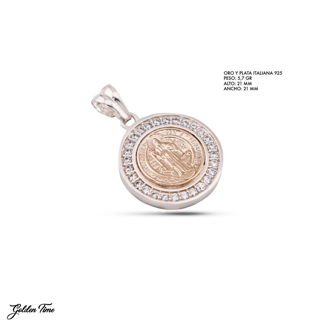 dije san benito destello, oro y plata italiana 925, medalla san benito, dije con cristales, dije protector, joyería devocional, dije circular, estilo urbano espiritual