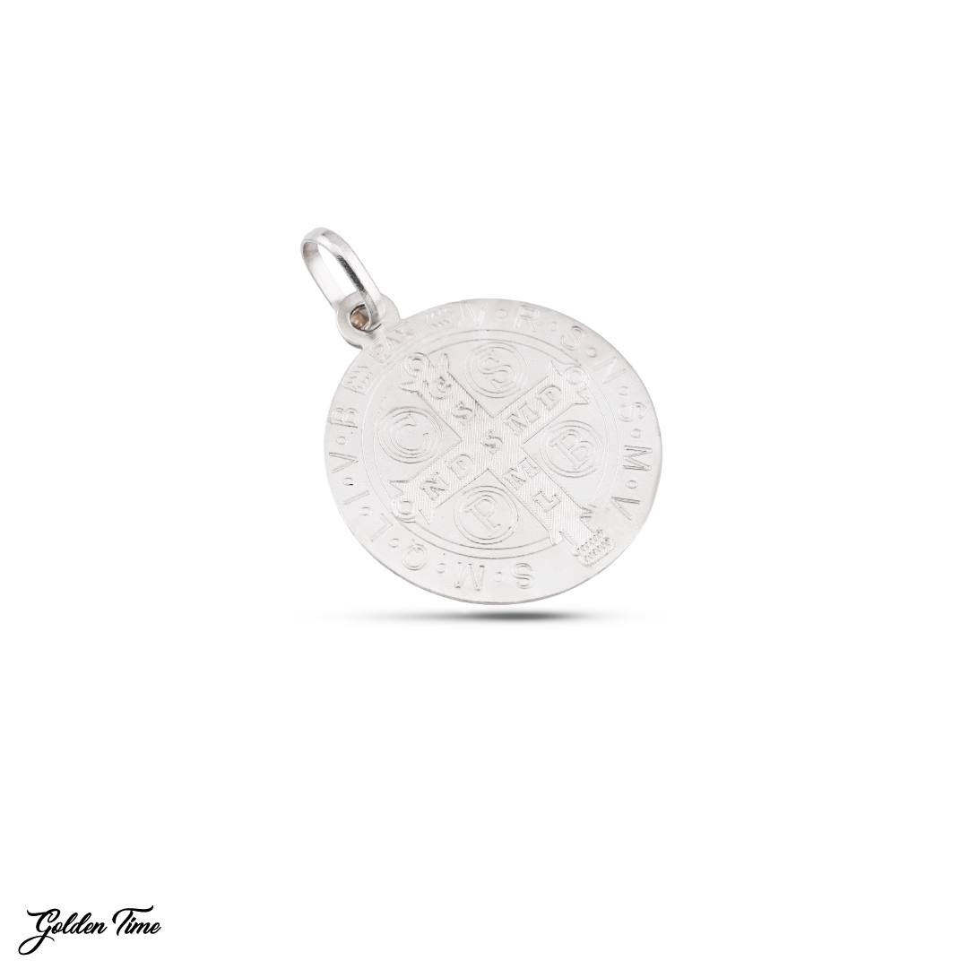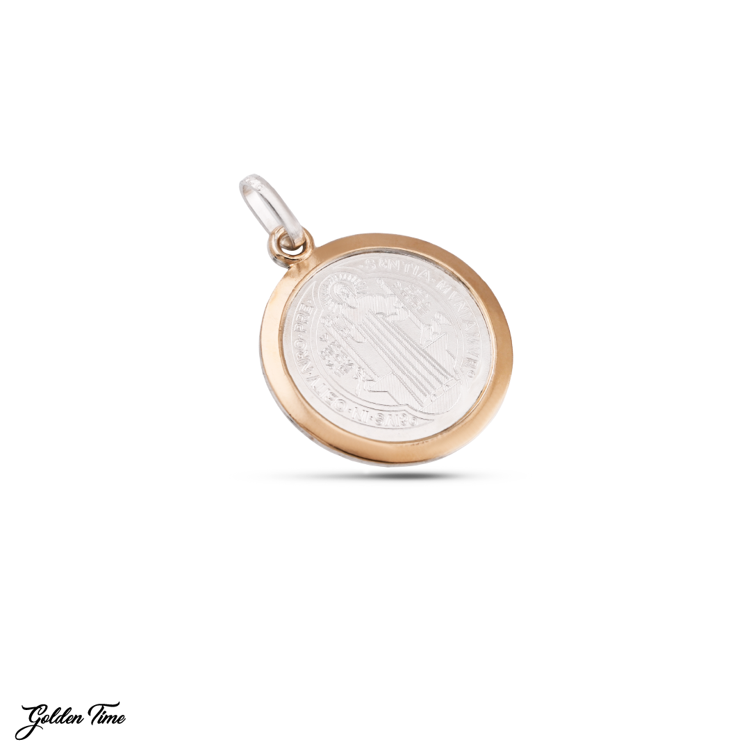 Este diseño circular presenta la medalla de San Benito en un acabado plateado brillante, enmarcada por un aro dorado pulido que aporta contraste, presencia y un toque sofisticado sin perder frescura urbana. Su tamaño medio lo hace ideal para uso diario con un estilo espiritual contemporáneo.