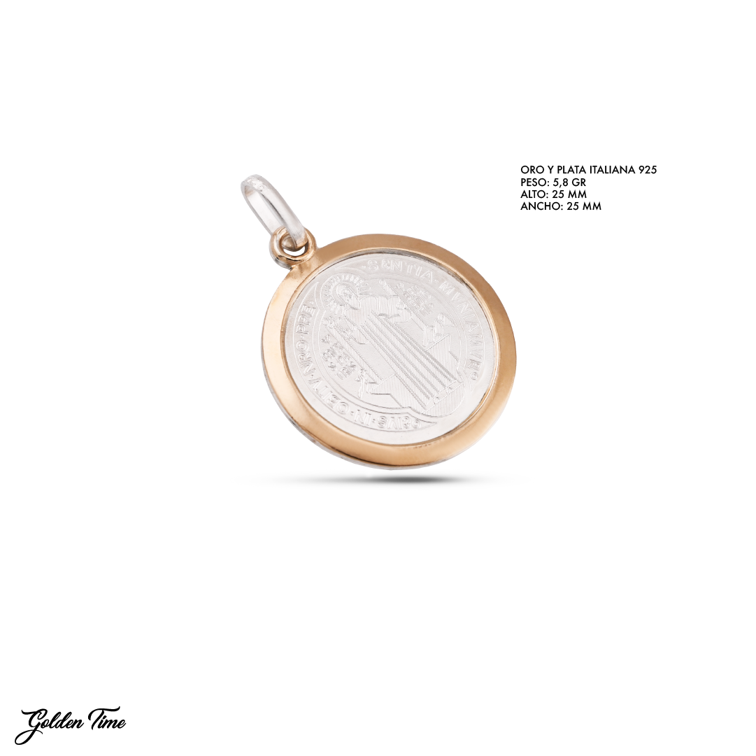 dije san benito aro, plata italiana 925, borde dorado, medalla san benito, dije protector, joyería devocional, estilo urbano espiritual, dije circular